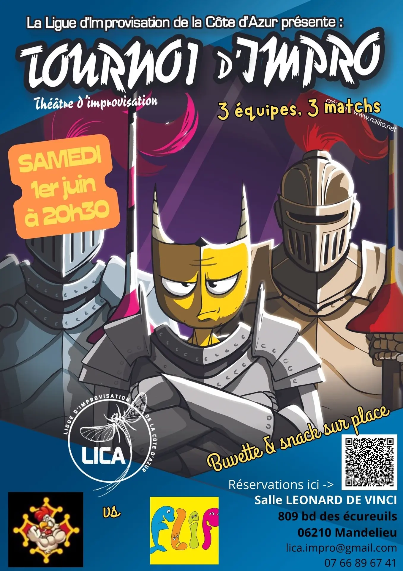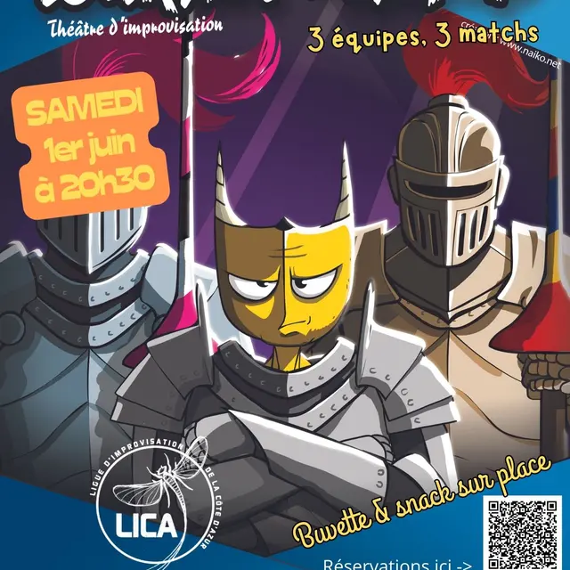 Le 1er juin, la LICA va jouter avec deux équipes de renom venues de contrées (plus ou moins) lointaines pour un tournoi d'improvisation mené tambour battant. Voici poindre à l'horizon les bannières de la FLIP de Montauroux et de la TIMY de Toulouse ! Alors revêt prestement tes plus beaux atours et entre en lice avec nous. Et advienne que pourra !