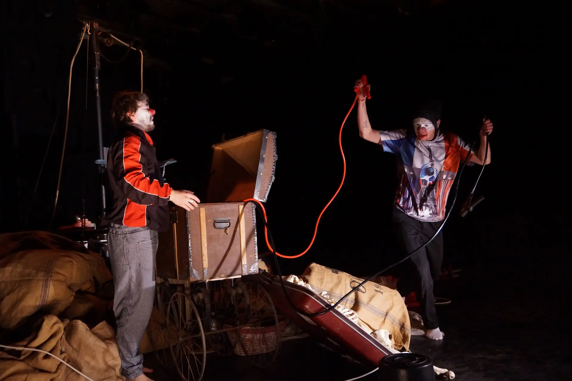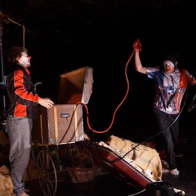 Deux clowns parcourent un pays à la recherche de son âme, explorant les contradictions et les passions qui animent son identité. Une résidence de la Compagnie Idiot cherche village et du Collectif Xanadou.