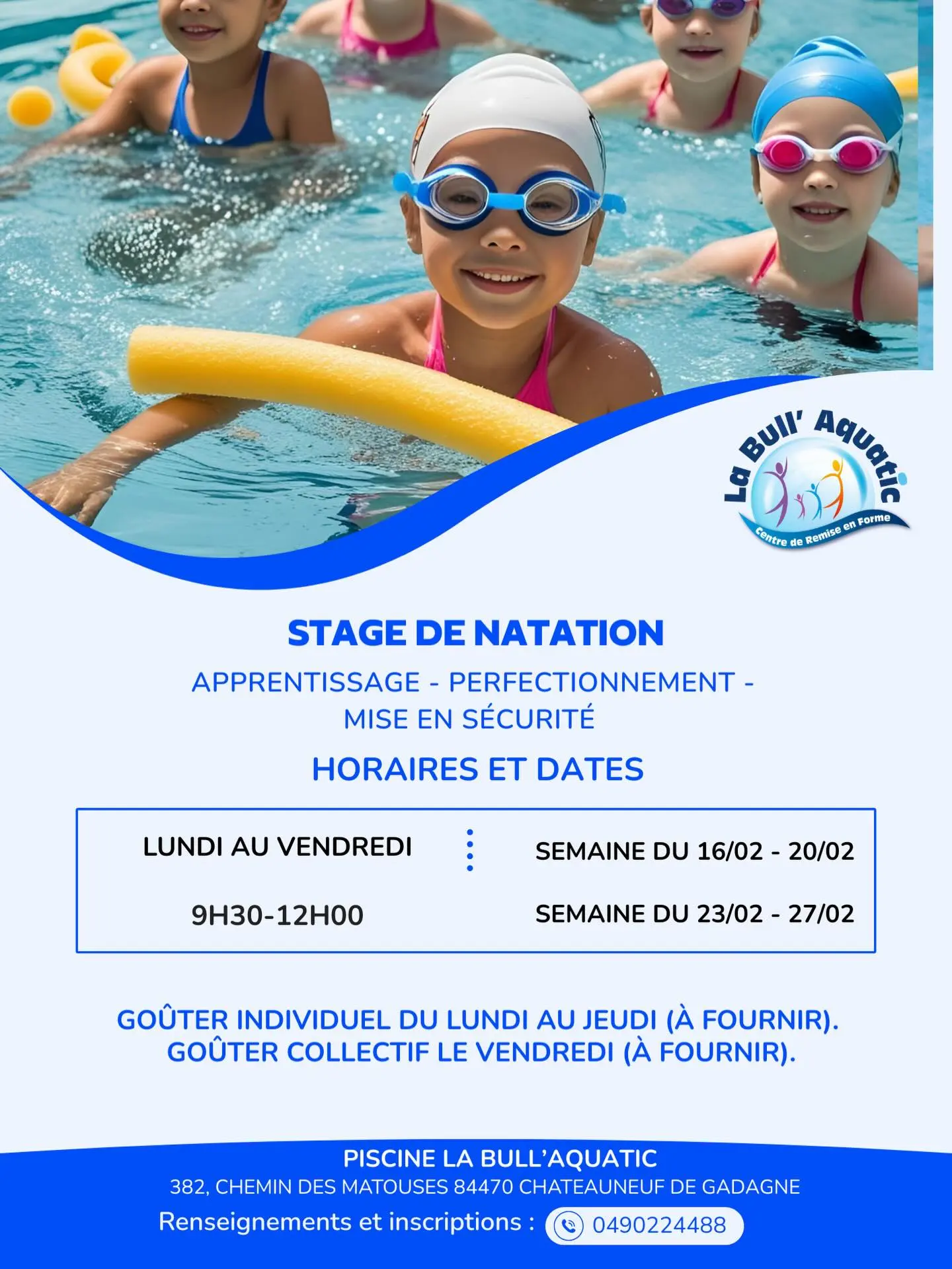Stage de natation à Châteauneuf-de-Gadagne. Apprentissage, perfectionnement et mise en sécurité pour les enfants de 5 à 12 ans à la piscine La Bull’Aquatic. Sur inscription.