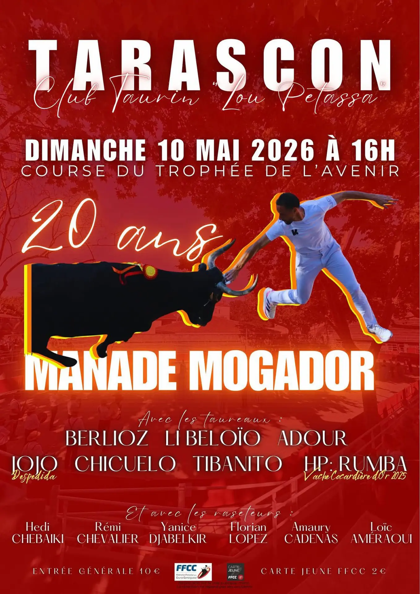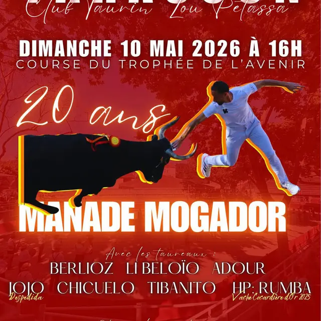 Oyé oyé ! Dimanche 10 mai pour notre seconde course de la saison? à l'occasion des 20 ans de la manade mogador, côté taureaux Berlioz, Libeloio, Adour, Tibanito, Chicuelo qui a fait ses débuts dans les arènes de Tarascon, ou encore Jojo qui fera sa despedida et la vache cocardiere d'or 2025 Rumba ! Côté razeteurs Chebaiki Hedi, Chevalier Remy, Djabelkir Yanice, Lopez Florian, Cadenas Amaury, Ameraoui Loic !