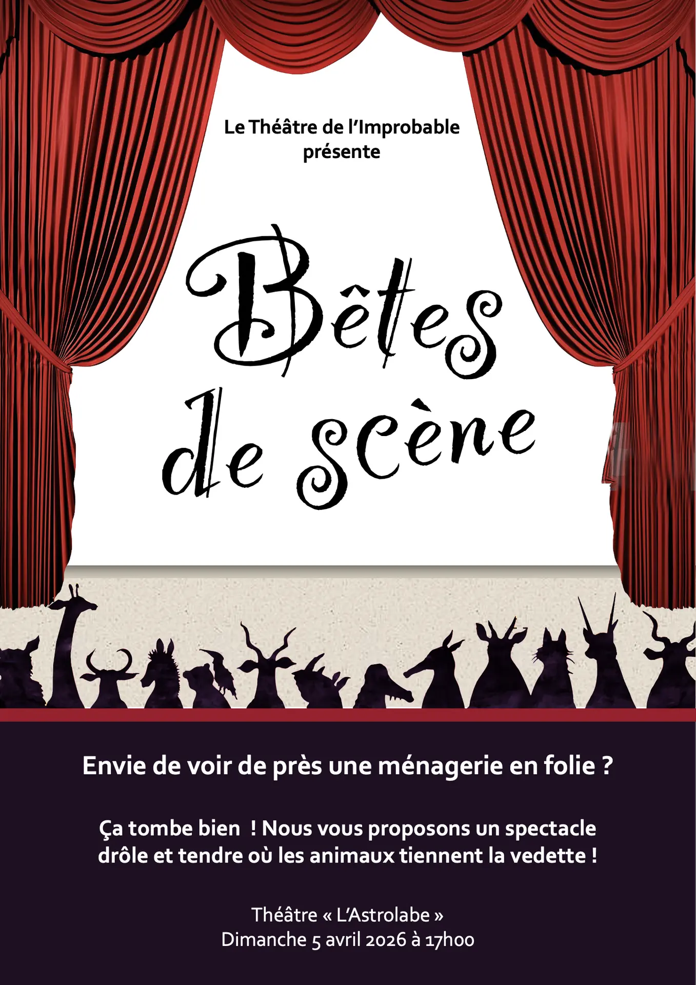 Un cirque où les animaux ne sont pas présents en chair et en os, mais où notre imagination… et la vôtre… leur donnent vie dans une série de rencontres insolites où humour et dérision ne sont jamais bien loin. Envie de découvrir ce bestaire cocasse et incongru ? N’hésitez plus ! Prenez le taureau par les cornes et venez vous jeter dans la gueule du loup nous y garderons les cochons ensemble…