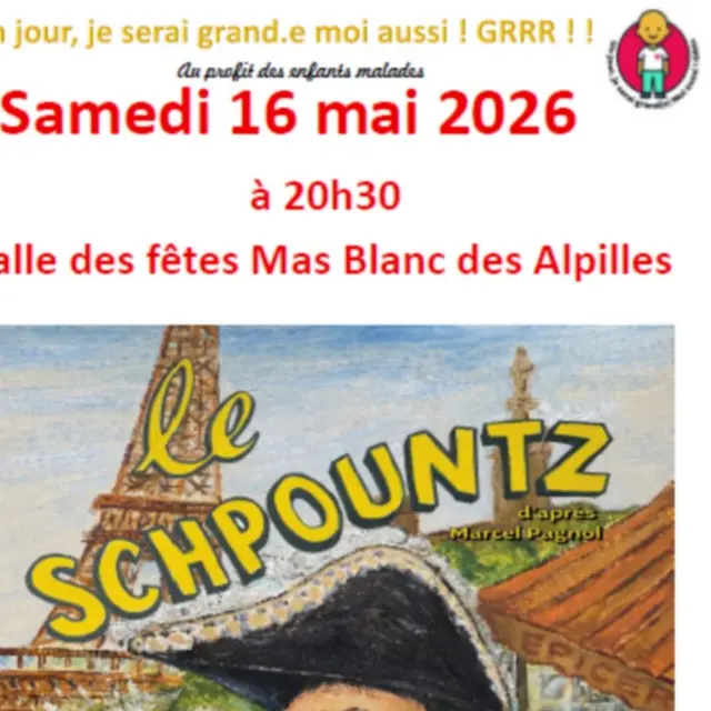 Dans le cadre de notre campagne en faveur des enfants malades, l’association MCBAM vous propose la pièce de Marcel Pagnol Le Schpountz à la Salle Polyvalente de Mas Blanc les Alpilles