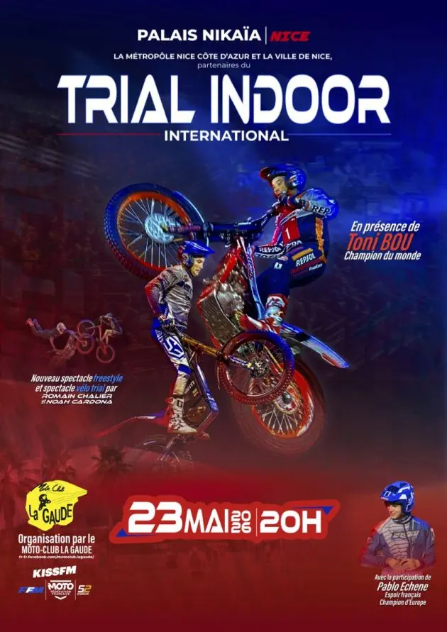 Le Trial Indoor revient à Nice avec un nouveau spectacle ! Les meilleurs pilotes mondiaux seront présents pour un show exceptionnel. Show son et lumière, avec également une démonstration VTT Trial et freestyle, qui ravira les petits comme les grands !