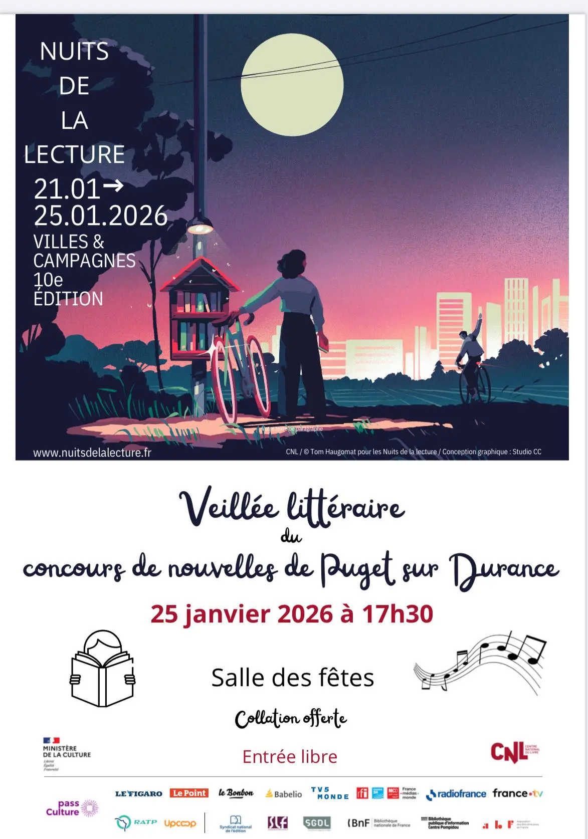 Célébrez les "Nuits de la lecture" à Puget ! Découvrez les lauréats du concours de nouvelles lors d'une veillée littéraire et musicale. Au programme : lecture par un conteur, musicien, expo de livres d’artistes et collation offerte.