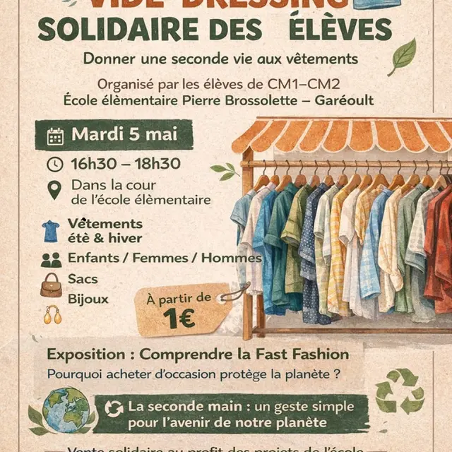 Venez chiner, faire de bonnes affaires et donner une seconde vie aux vêtements dans une ambiance conviviale et pleine de bonne humeur ! Donner une seconde vie aux vêtements. Vente solidaire au profit des projets de l'école.