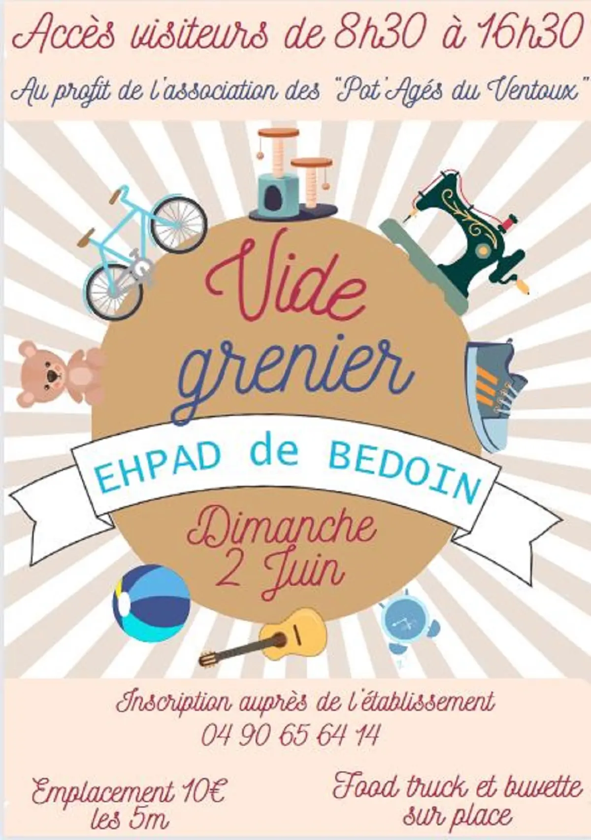 L'EHPAD de Bédoin fait son 1er vide grenier. Au profit de l'association de l'établissement : Les Pot'âgés du Ventoux. Avec le printemps vient le fameux tri , venez vendre tout ce dont vous ne vous servez plus.
