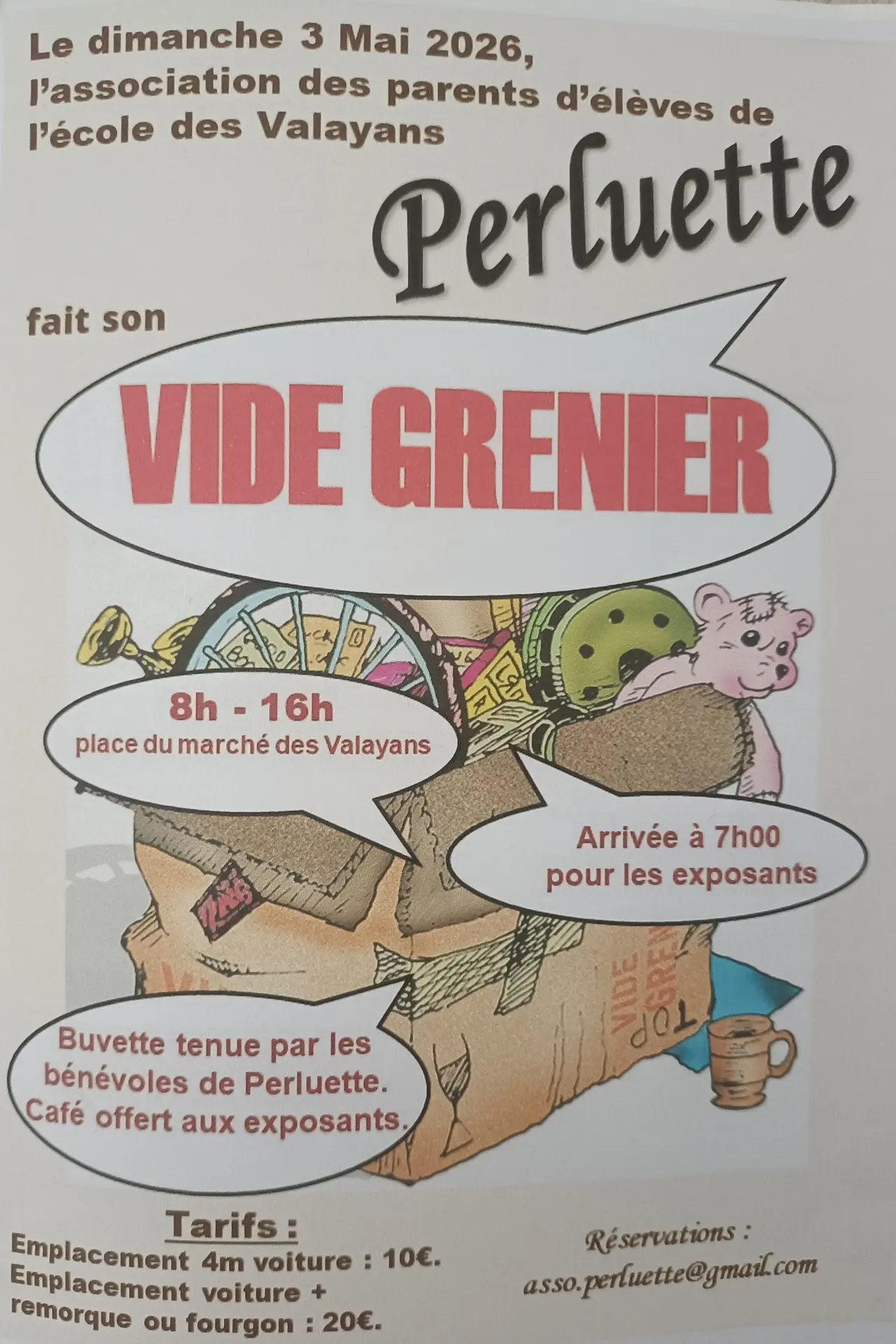 Dimanche 3 mai de 8h à 16h, venez au vide-grenier organisé par l'association des parents d'élèves de l'école des Valayans "PERLUETTE", sur la place du Marché au hameau des Valayans.