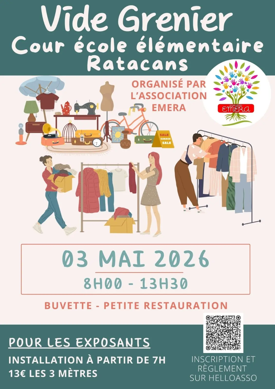 L'Association EMERA organise la 2ème édition de son vide grenier le Dimanche 03 Mai 2026 au cœur de la cour de l'école élémentaire des Ratacans !