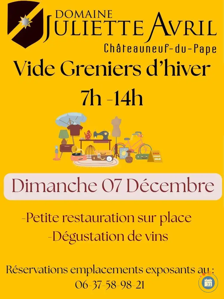 Venez chiner et trouver des trésors au Domaine Juliette Avril : objets de maison, vêtements, livres, jouets, meubles, etc. L'occasion de faire de bonnes affaires & de donner une seconde vie à vos objets. Dégustation de vin & petite restauration sur place