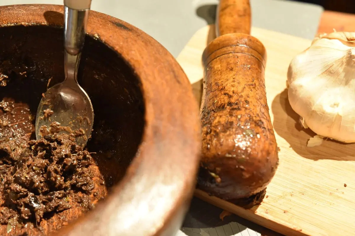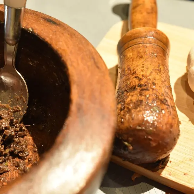 Après la visite, confection de tapenade à l'ancienne au mortier et dégustation sur place.