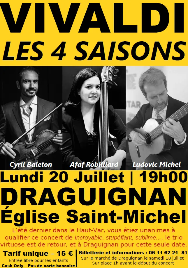 L'été dernier, le concert de ce trio virtuose dans le Haut-Var a été unanimement salué comme incroyable, stupéfiant et sublime. Le groupe revient pour une représentation exclusive à Draguignan. Ne manquez pas cette occasion unique de découvrir ou redécouvrir leur interprétation des "Quatre Saisons" de Vivaldi.