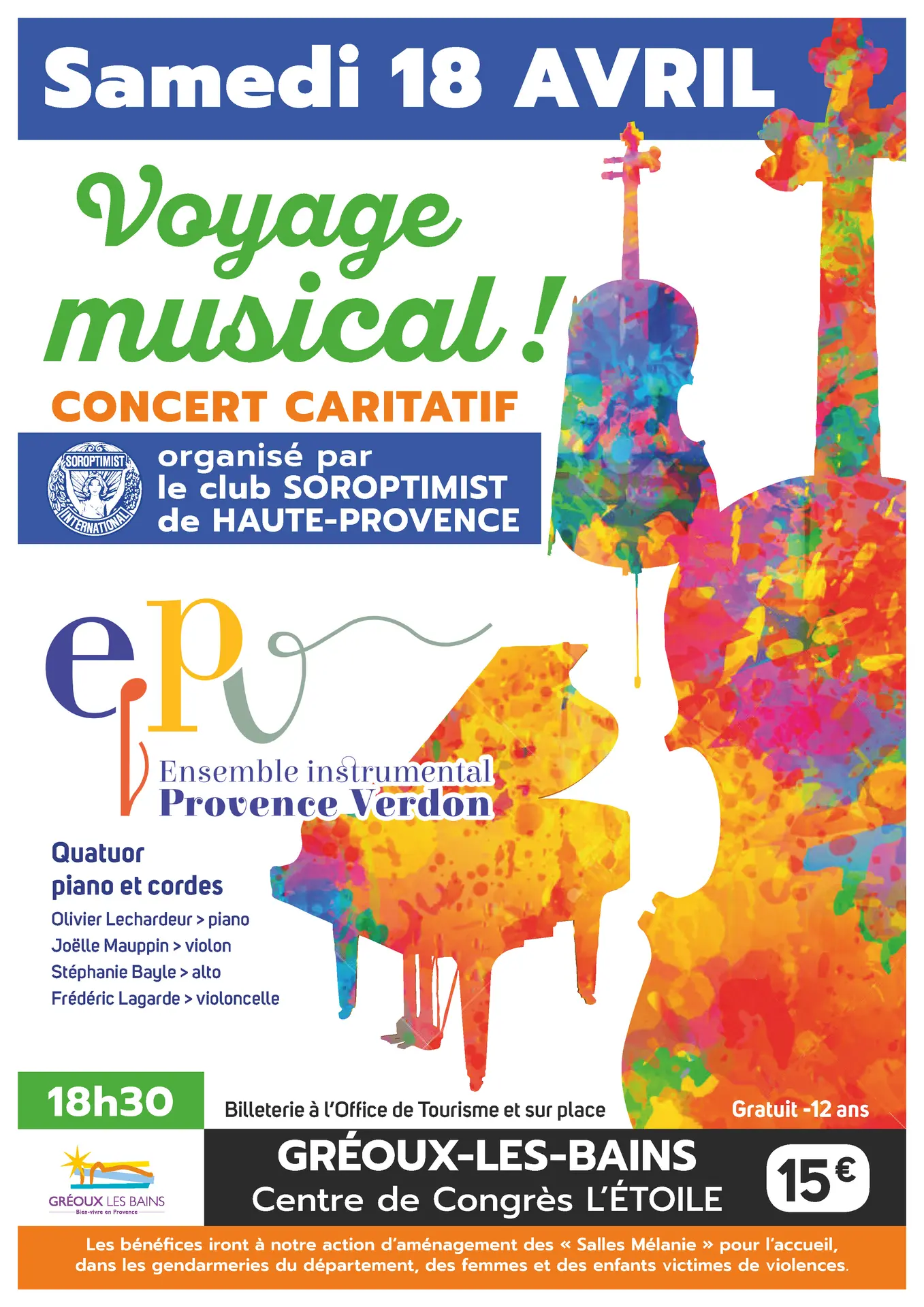 Concert caritatif Voyage musical, organisé par le club Soroptimist de Haute-Provence avec l’Ensemble instrumental Provence Verdon. Quatuor piano-cordes : O. Lechardeur (piano), J. Mauppin (violon), S. Bayle (alto), F. Lagarde (violoncelle).