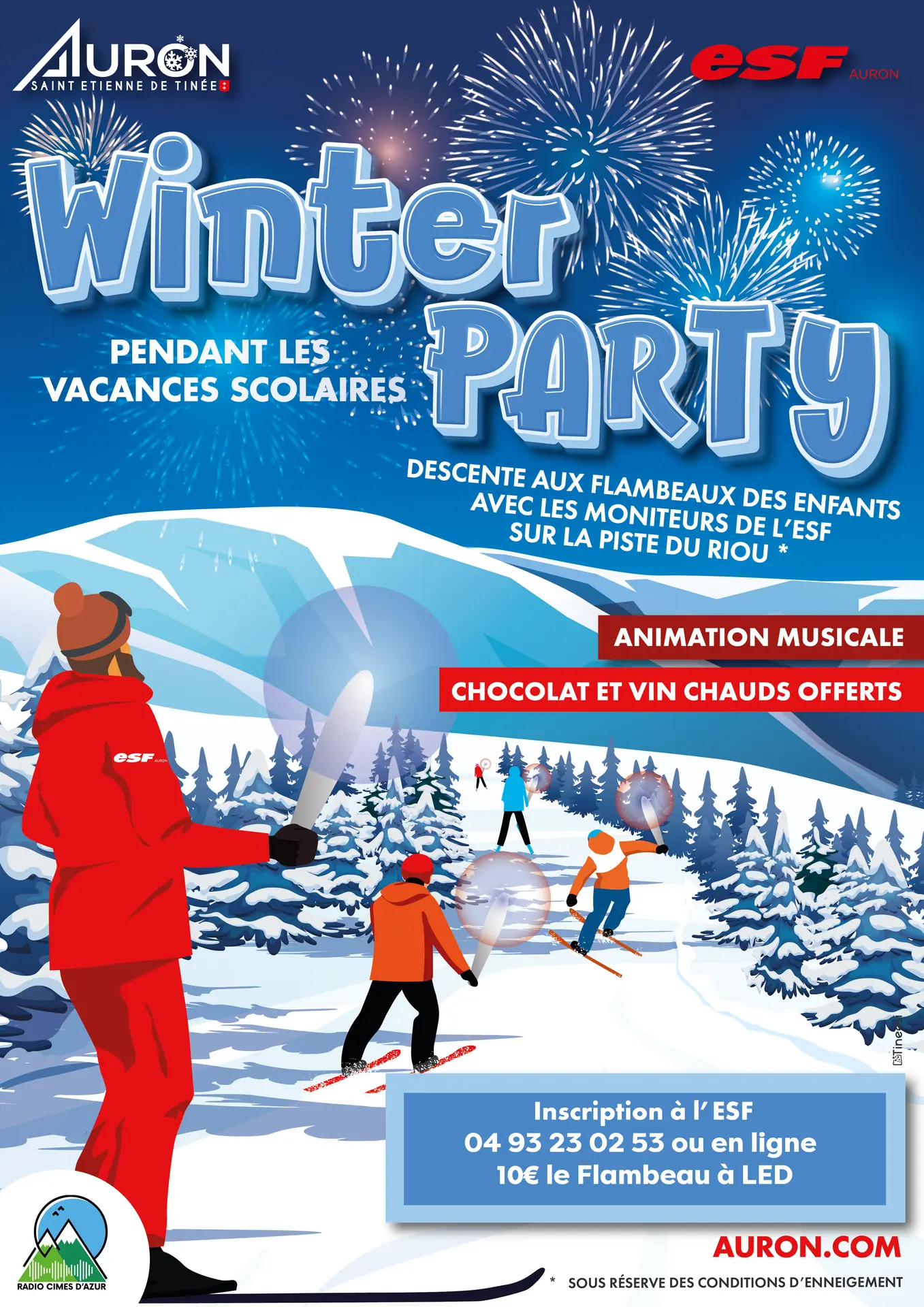 Descente à ski aux flambeaux des enfants (niveau flocon) et animation musicale avec les moniteurs de ski de l'ESF d'Auron dès 18h. Piste du Riou ou sur traversée 2000/vallons/nabines. Accessible aux skieurs et piétons. Boissons chaudes.