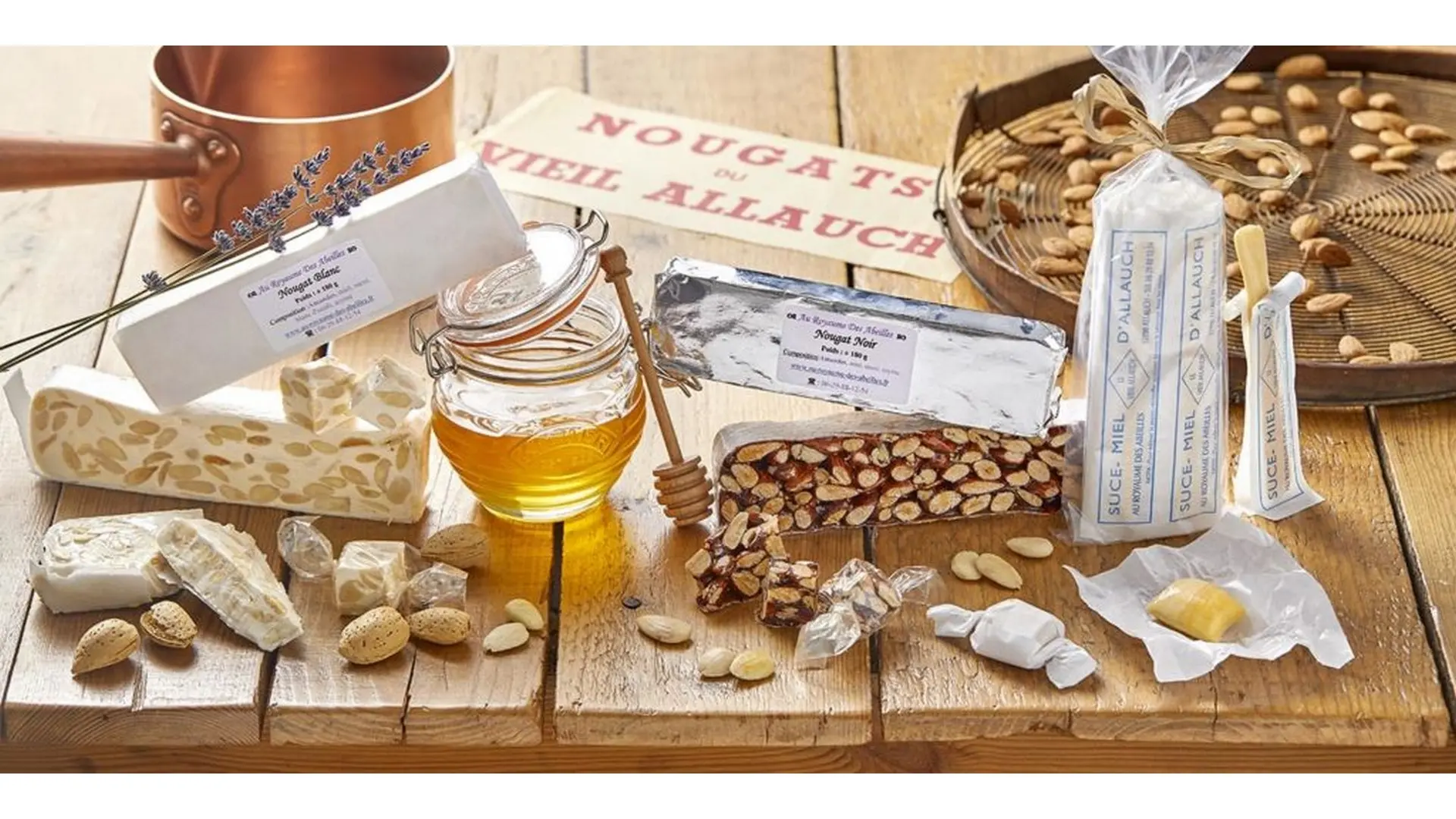 Confiseries et nougateries allaudiennes depuis 1937 : nougats, chiques, suce-miel, pain d'épices, biscuits de Provence et miels de la région.