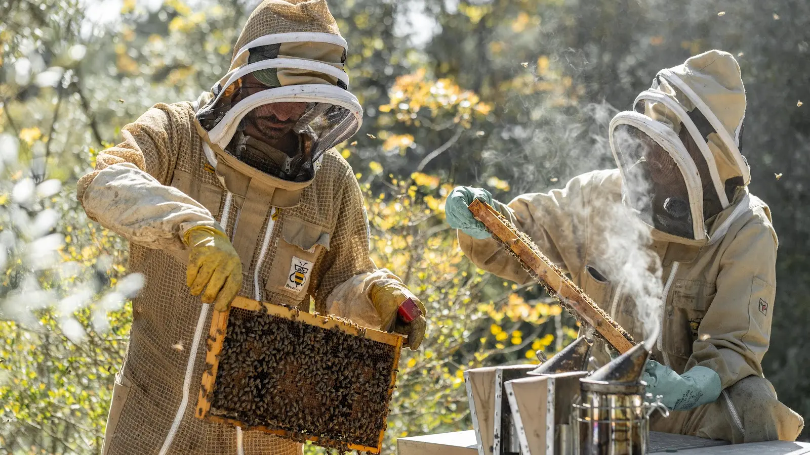 Caroline et Quentin, jeune couple fraîchement reconverti à l'aube de la trentaine pour lancer ce projet de ferme apicole. Ils ont décidé, après quelques pérégrinations et une solide formation en exploitations - qui les aura fait voyager du Nord au Sud de la France jusqu’à à la Réunion - de poser leurs valises à Puyricard, dans la campagne aixoise, entre Sainte Victoire et Luberon.