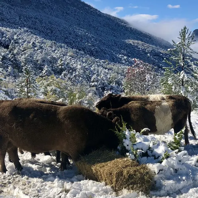 Côté vache : nous élevons principalement des galloways, en élevage biologique. Ces vaches écossaises sont rustiques et adaptées à nos climats parfois rudes. Cela nous permet de les laisser en pâture toute l'année. Les vaches et bœufs sont amenés à l'abattoir de Digne-les-Bains, abattoir certifié AB le plus proche. La viande est vendue en caissette de 8 à 10 kg de pièces variées.