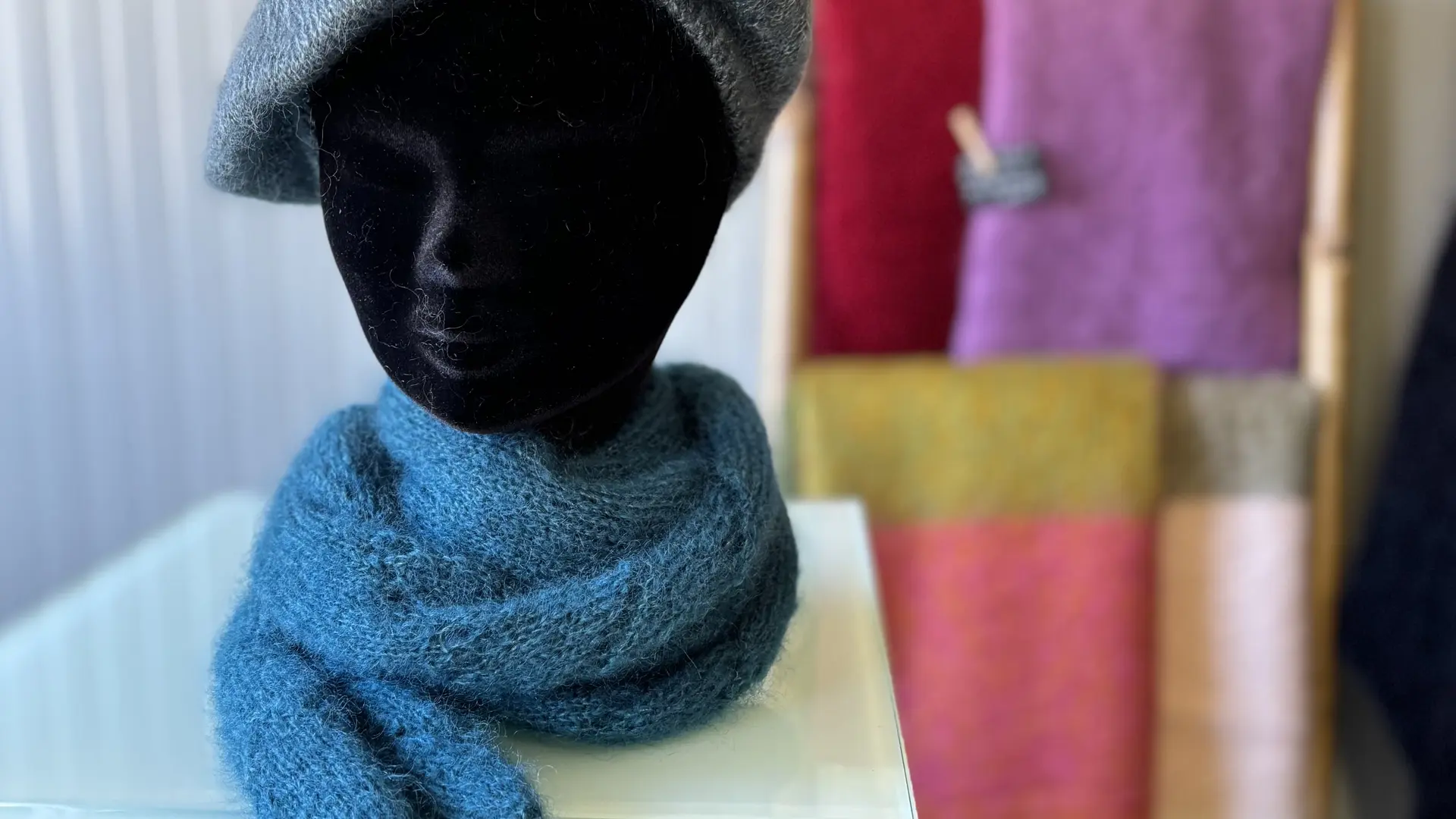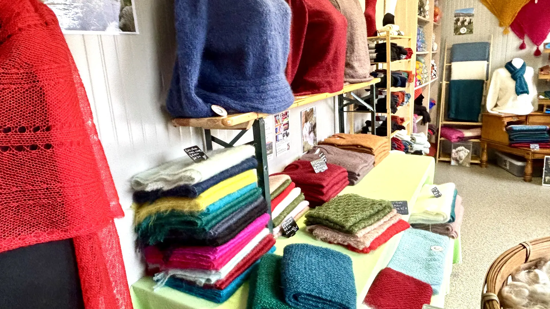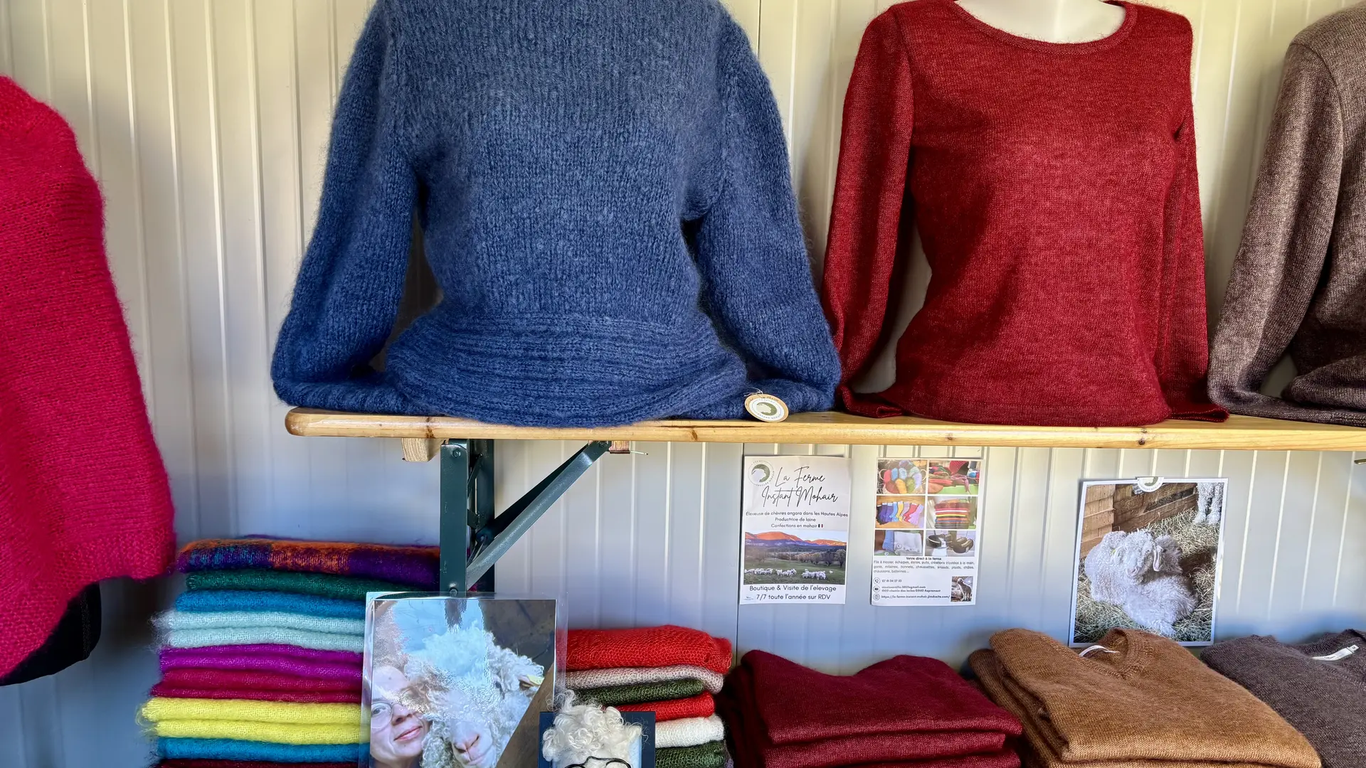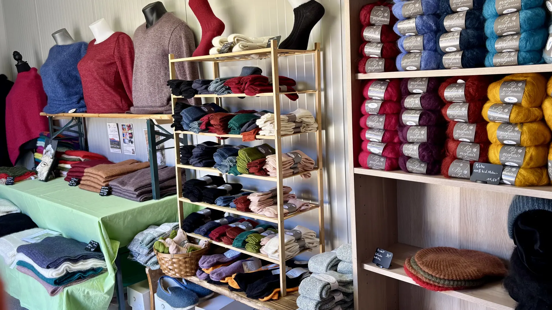 Dans sa boutique à la ferme, vous trouverez une large gamme d'articles : pelotes fils à tricoter ou à crocheter, écharpes et châles, pulls homme et femme, chaussettes, gants, mitaines, bonnets, chaussons, plaids etc.
