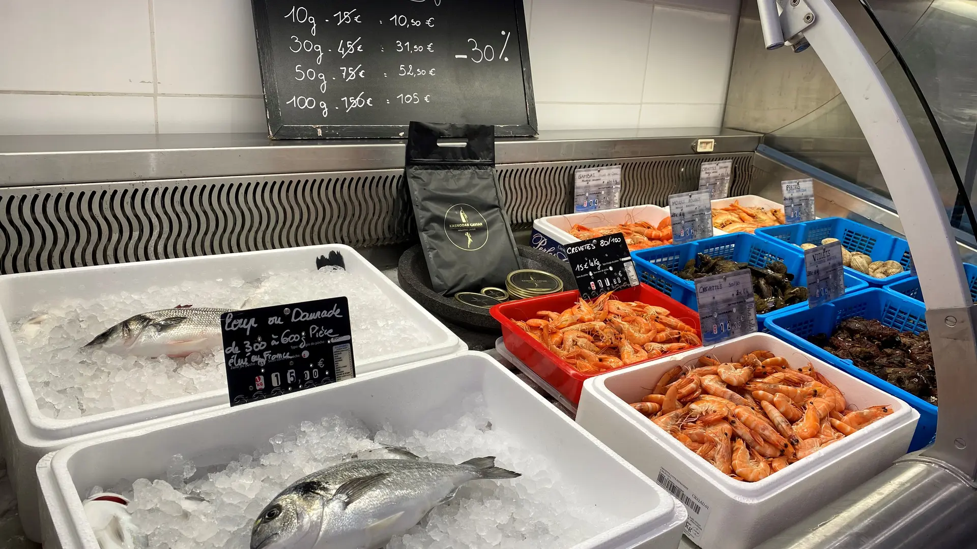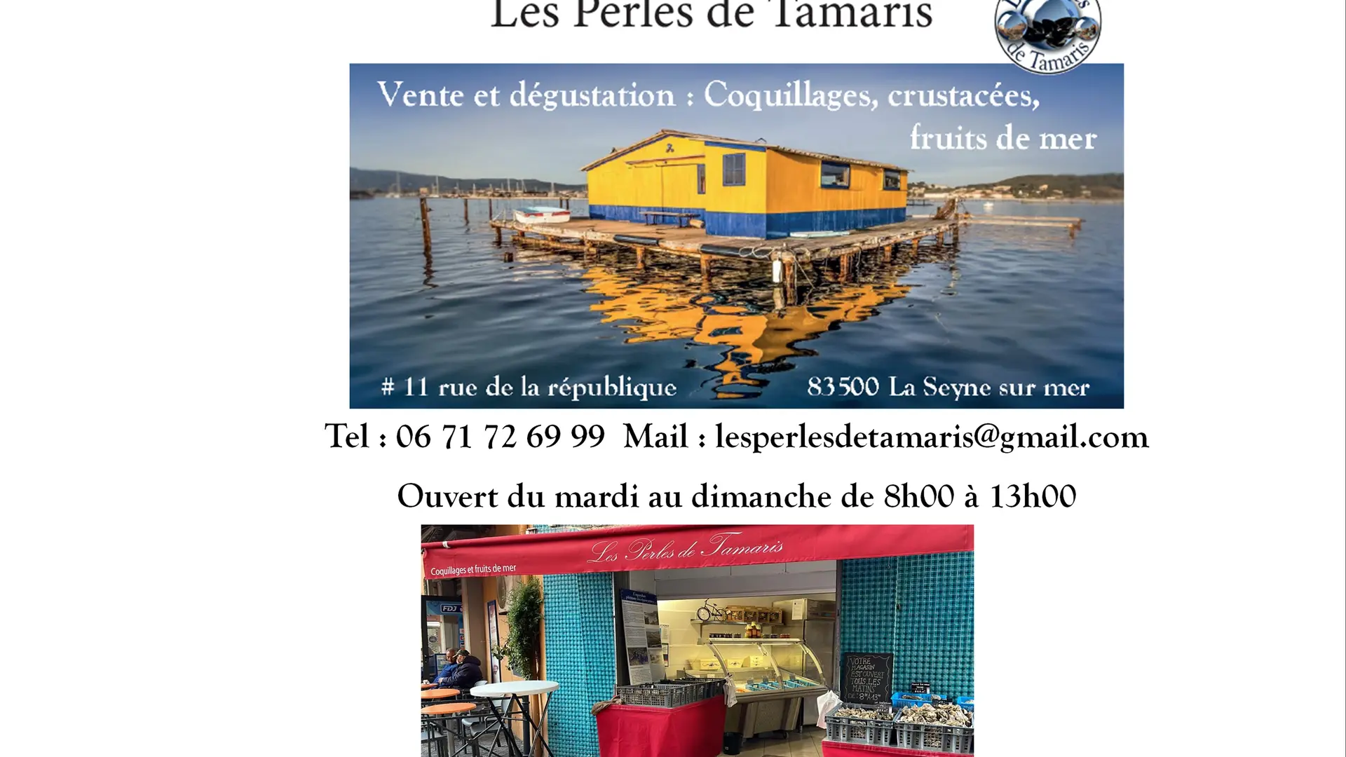 * Le Magasin du centre ville : Les Perles de Tamaris 11 rue de la république La Seyne sur mer du mardi au dimanche matin. Coquillages, fruits de mer et épicerie de la mer de 8h00 à 13h00 l'hiver et 15h00 l'été pour déguster tranquillement vos assiettes ou plateaux de coquillages.