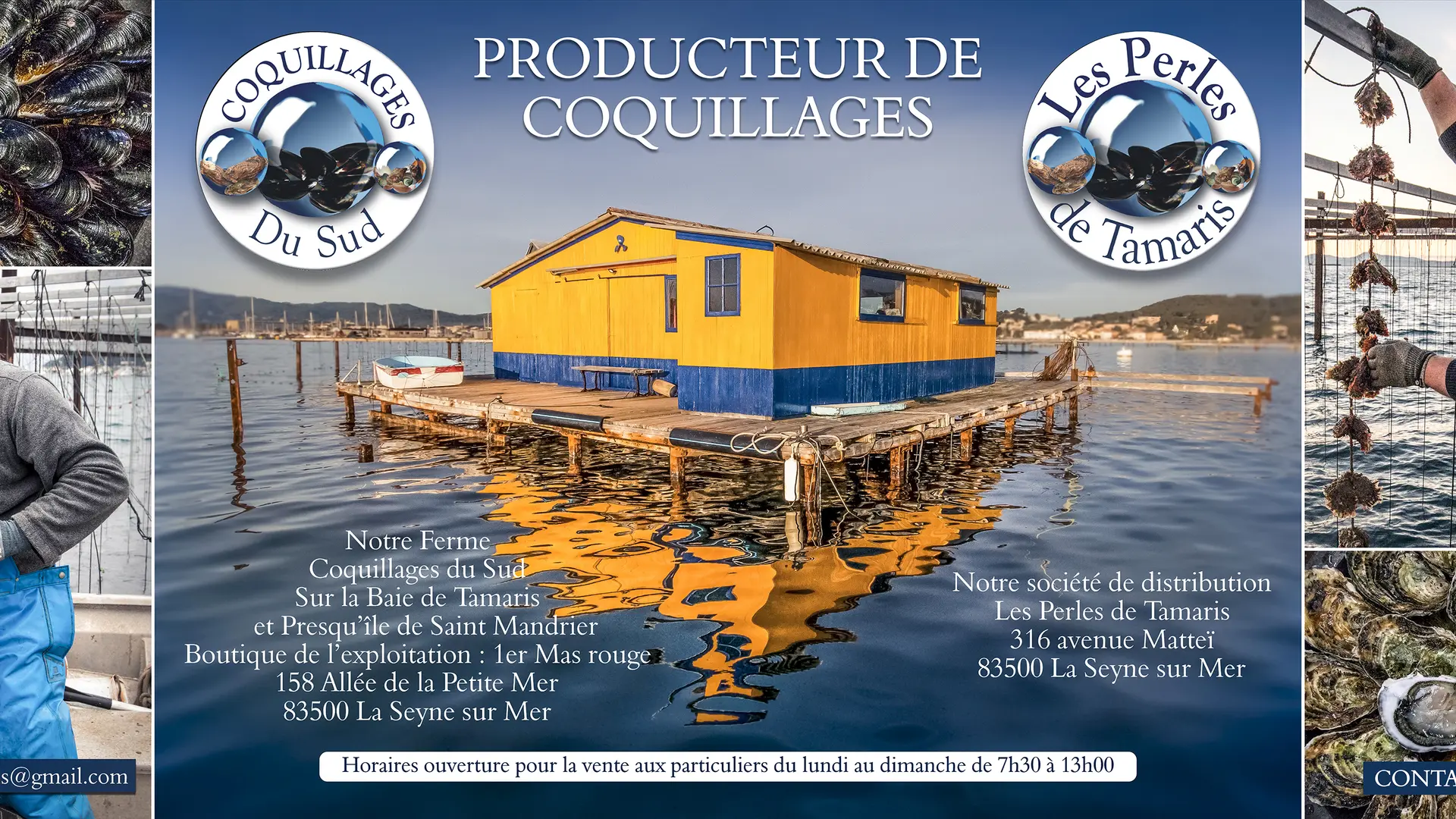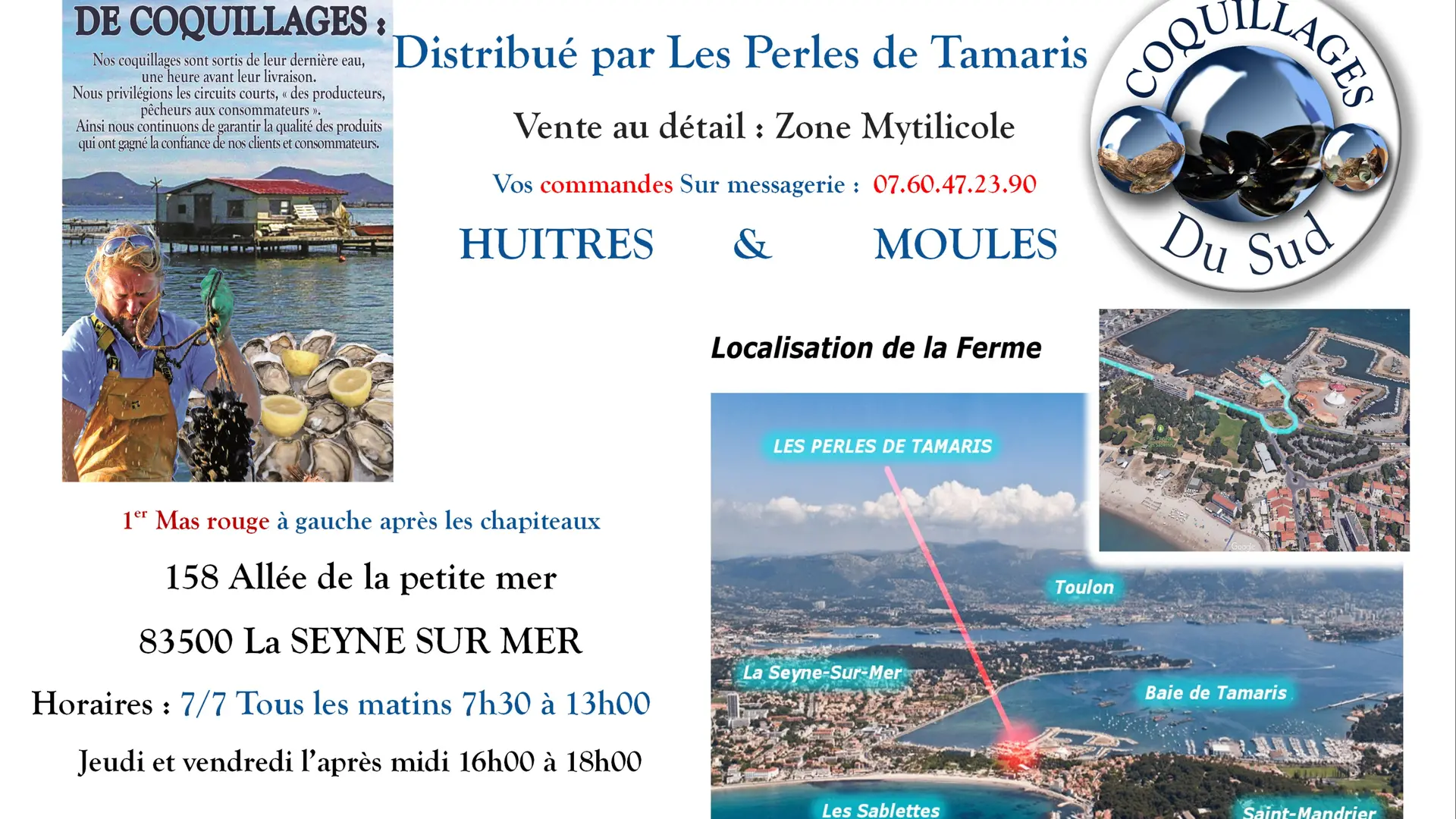> Sur l’exploitation Coquillages du sud, du lundi au dimanche de 8h00 à 13h00. 1er mas rouge au 158 allée de la petite mer à la Seyne sur Mer. Huitres et Moules