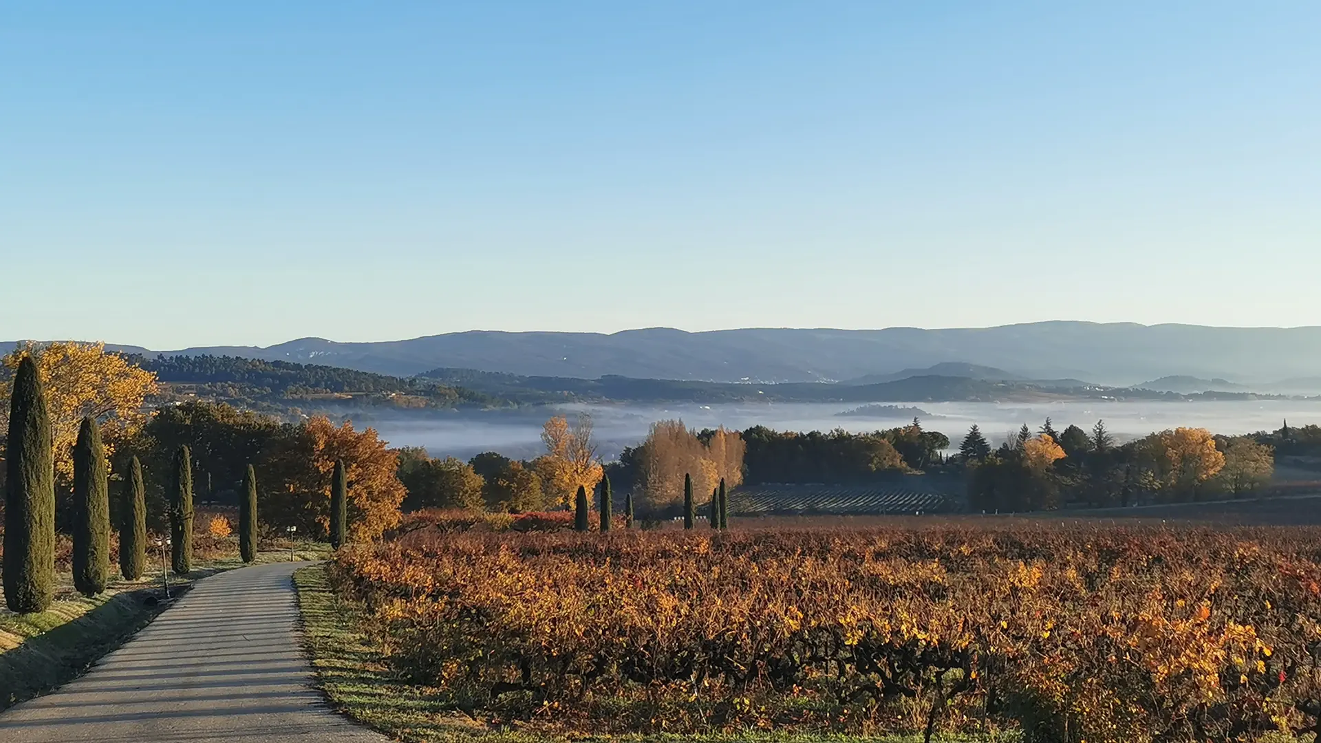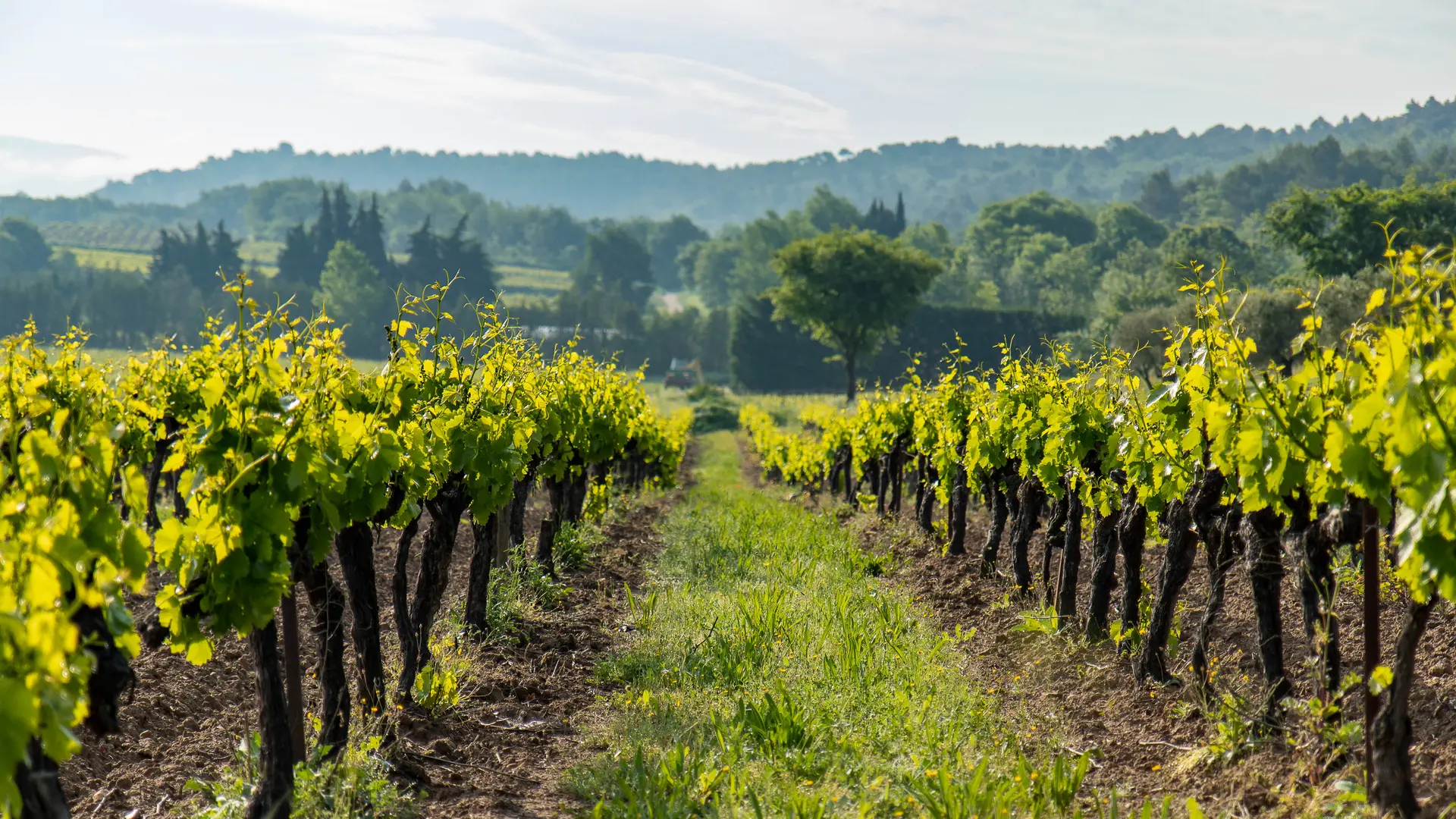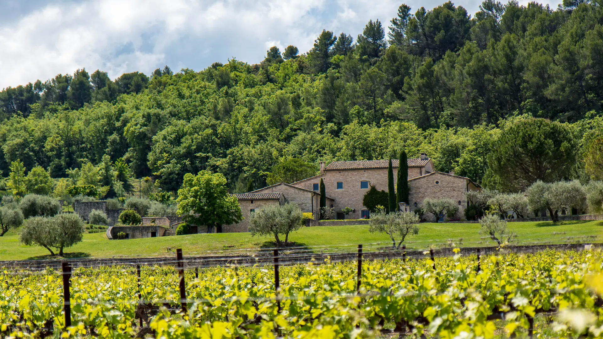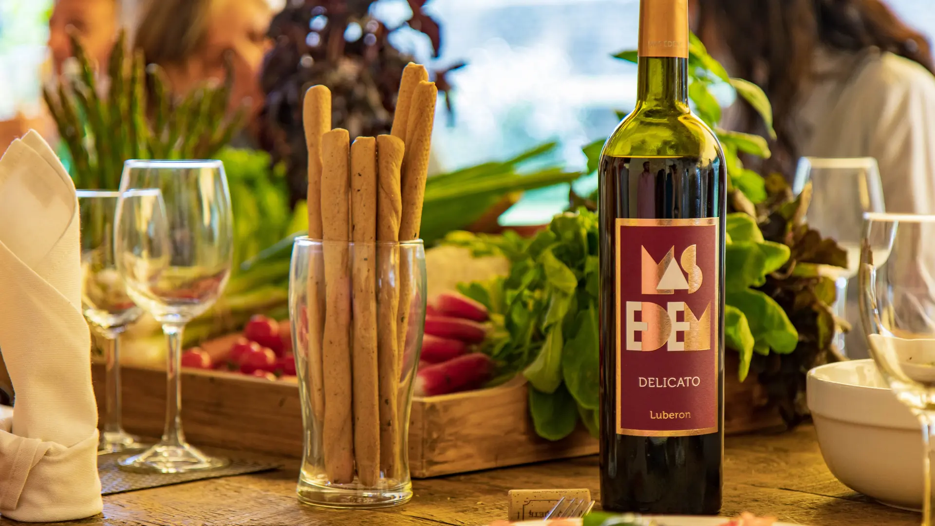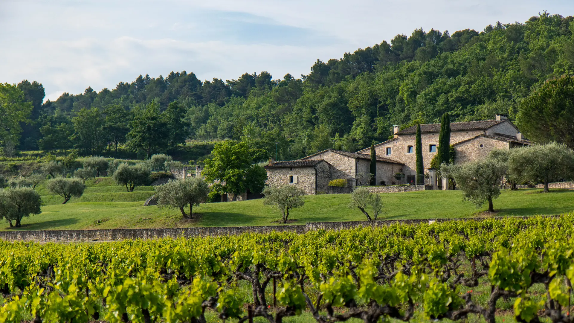 Pour accéder à Mas Edem, on franchit un haut portail, puis on emprunte une longue allée qui chemine à travers les vignes. Nichée sur les hauteurs du Luberon, la propriété offre une vue spectaculaire sur le domaine et son vignoble. Au loin se dessinent les villages de Goult et de Roussillon, surplombés à l’horizon par le majestueux Mont Ventoux.