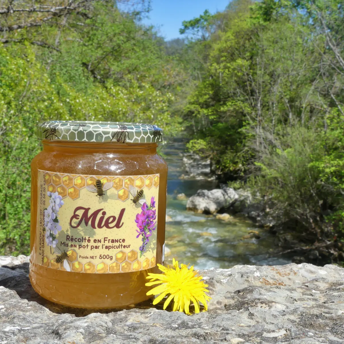 Apiculteur produisant son propre miel crémeux. Ruches à Eyguians et en transhumance (châtaignier). Miel toutes fleurs, lavande, châtaignier, en pots verre de 250gr, 500gr ou Kg.