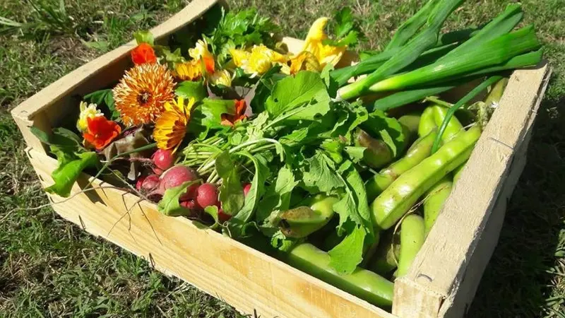 Sont proposés des abonnements pour des paniers hebdomadaires de fruits et légumes bio, issues de la permaculture et récoltés manuellement.