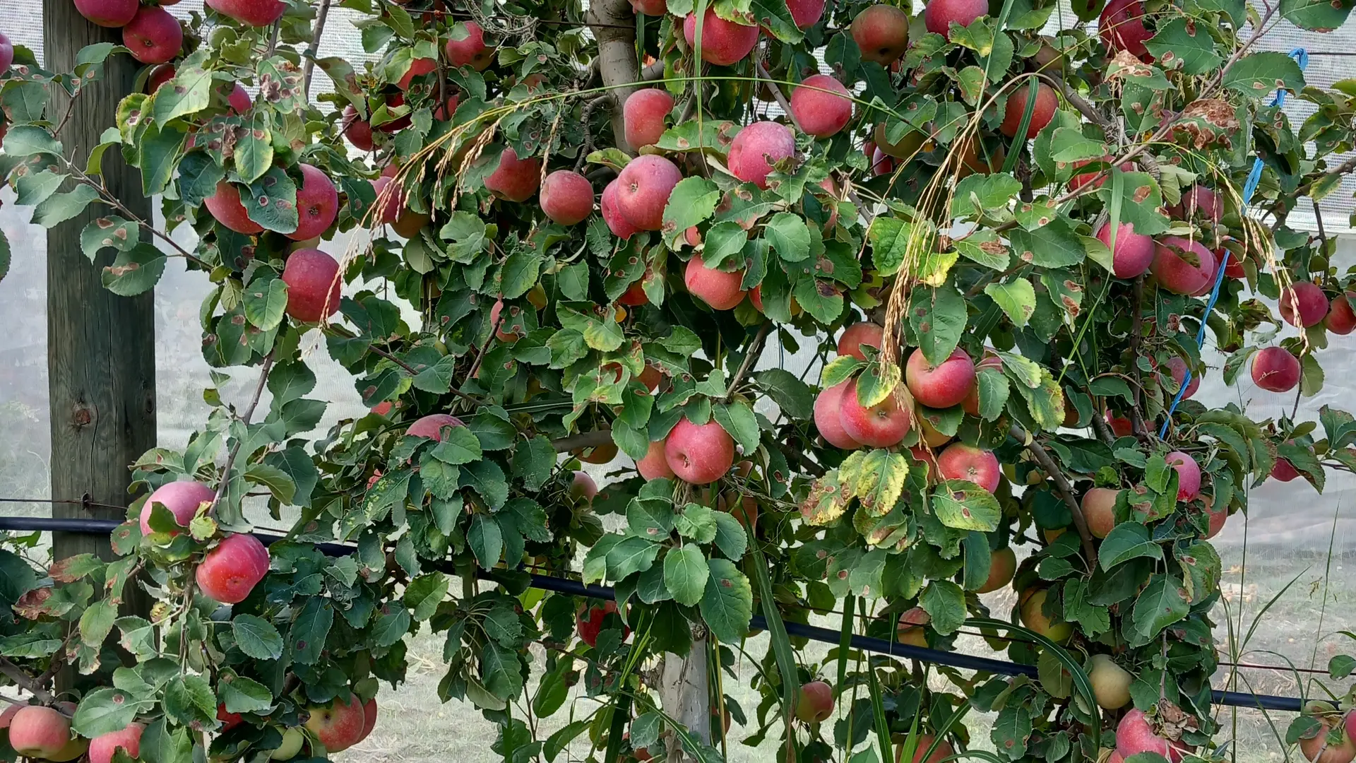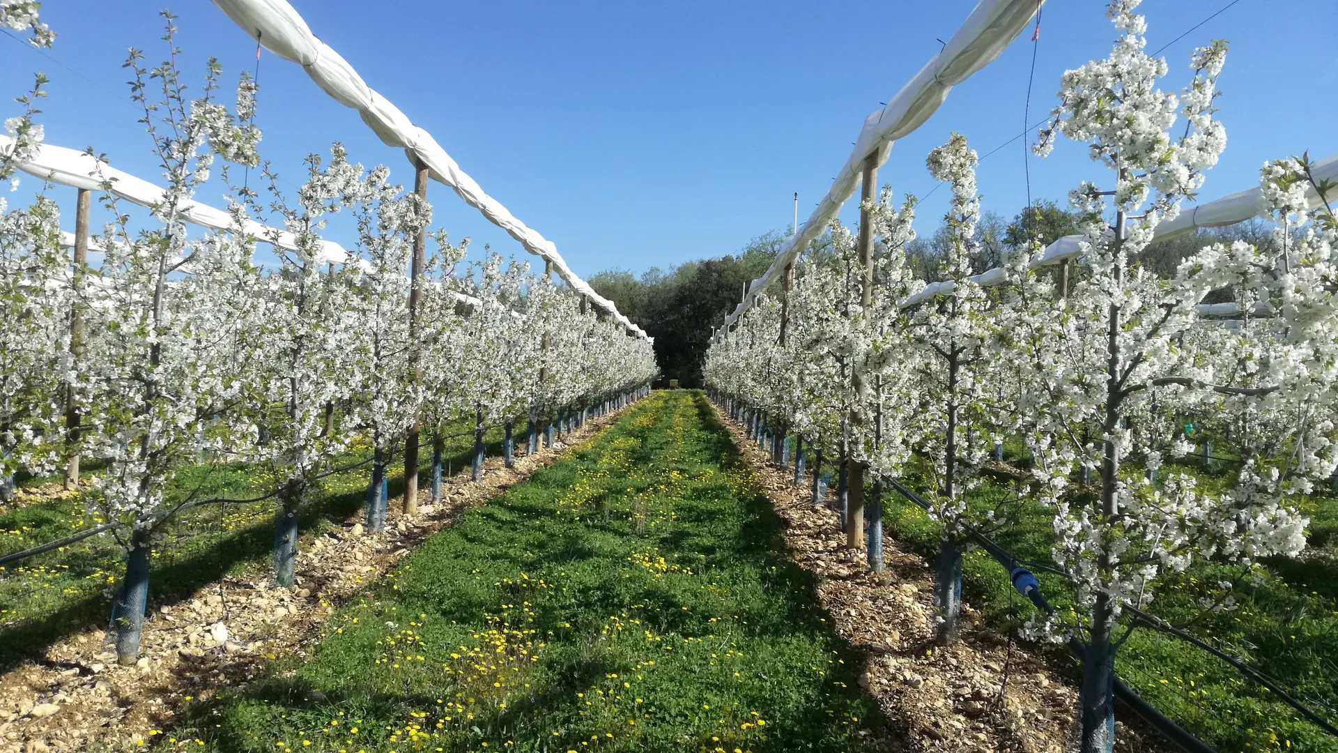 Nous protégeons certaines de nos cultures des changements climatiques avec des filets et de l'aspersion antigel pour préserver une production correcte.