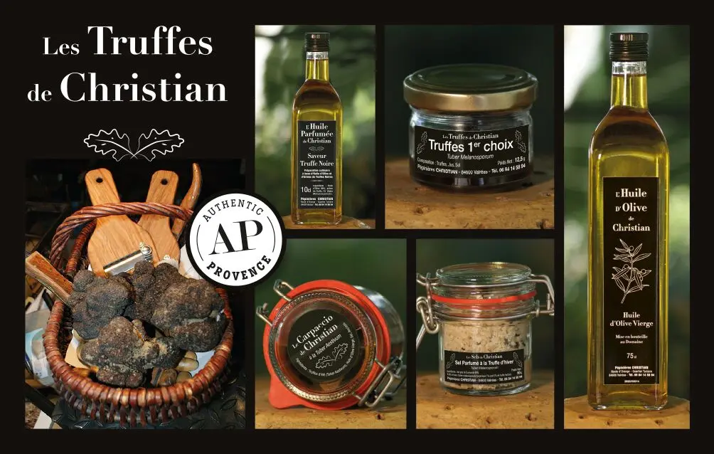 Plants truffiers, truffes fraîches, produits à base de truffes, verrines, huiles, sel, etc... Stand sur le marché de Richerenches le samedi matin.