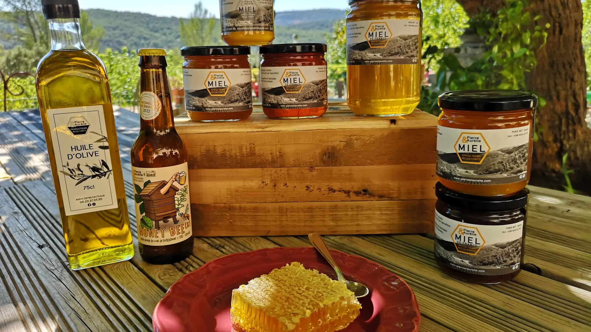 Production en famille et avec amour du miel et produits de la ruche : pollen frais, gelée royale. Une bière au miel de châtaignier (médaille d'Argent), des savons et cosmétiques artisanaux. Récolte dans le respect de l'abeille et mise en pots à la main.