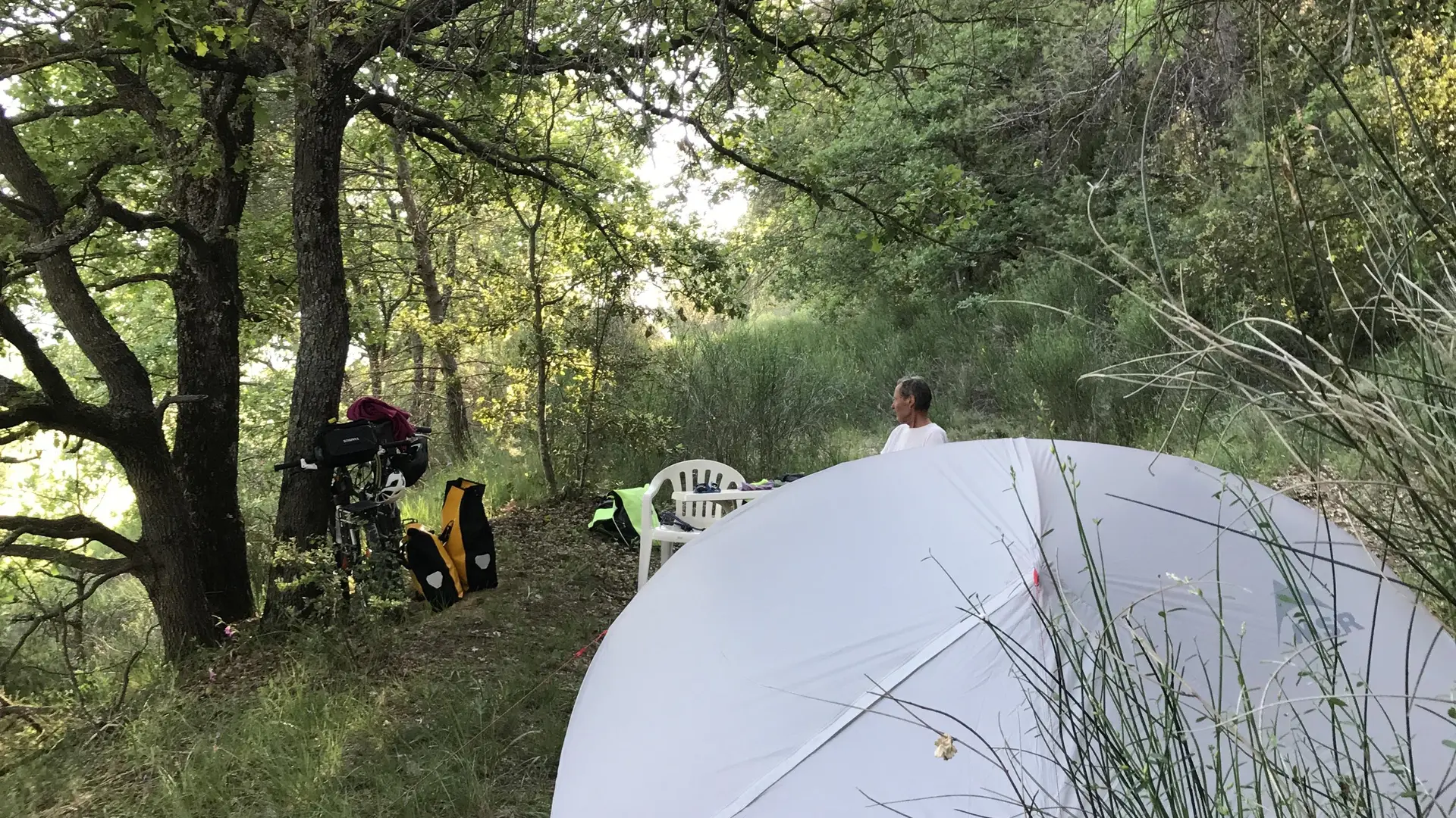 Juste en face des installations de la ferme en traversant une petite route, vos hôtes vous proposent un petit terrain en colline au cœur d’une petite forêt pour planter votre tente.