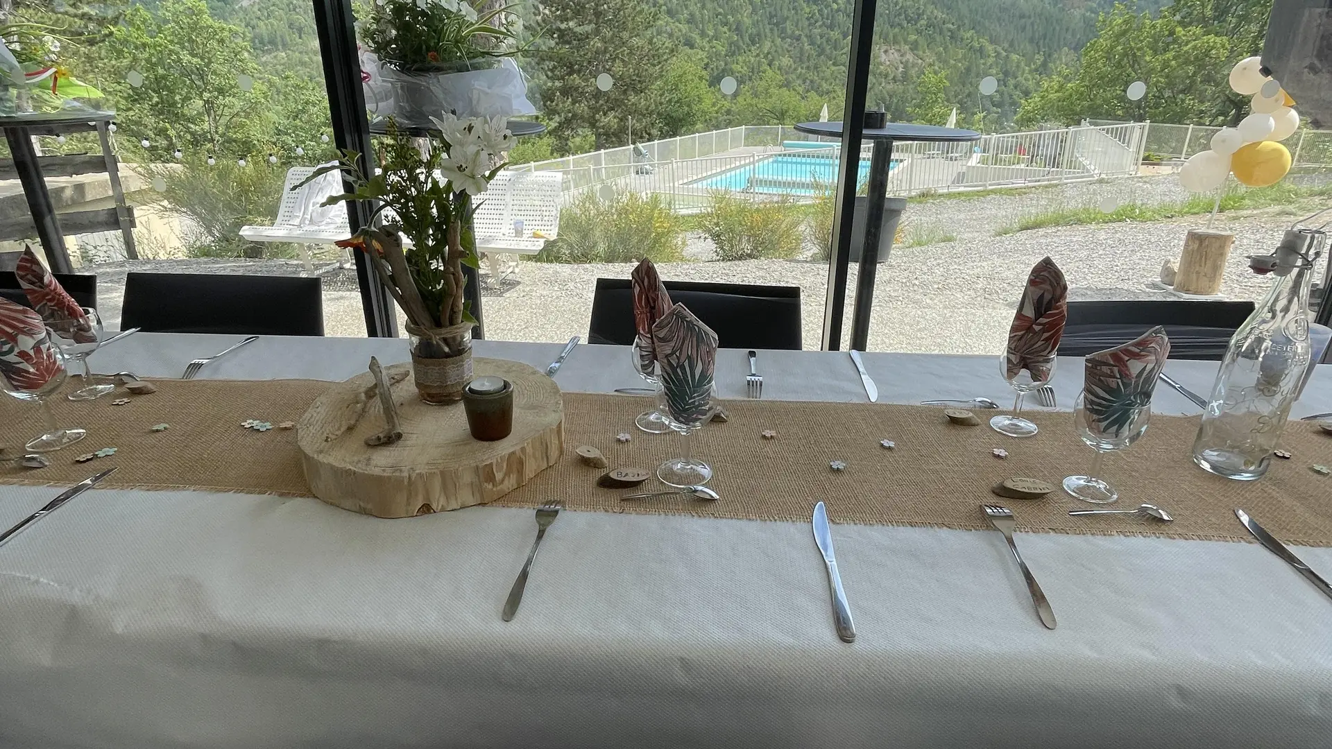 Différents services peuvent vous être proposés : au bord de la piscine face à la montagne de Jouère, dans un cadre exceptionnel ou bien dans notre salle de réception de 55 m2 avec son plafond cathédrale.