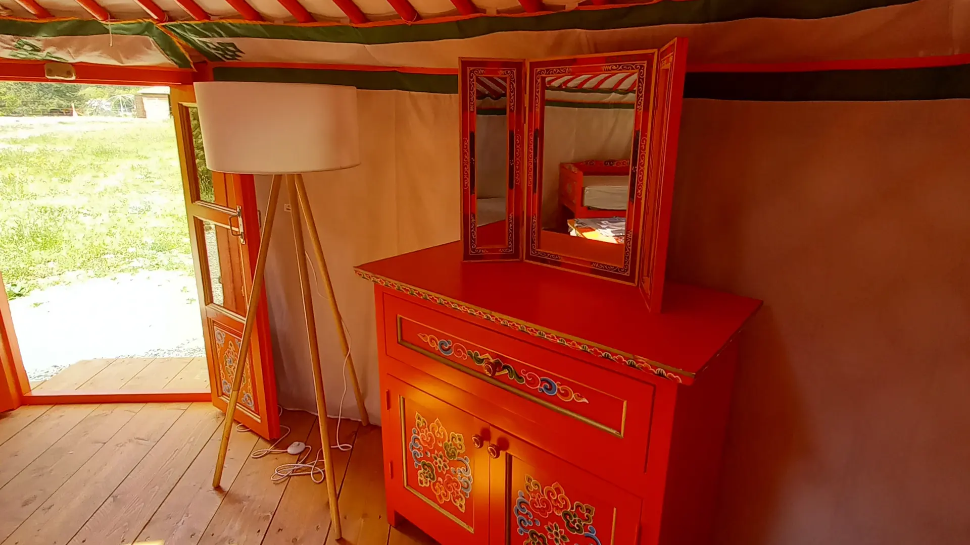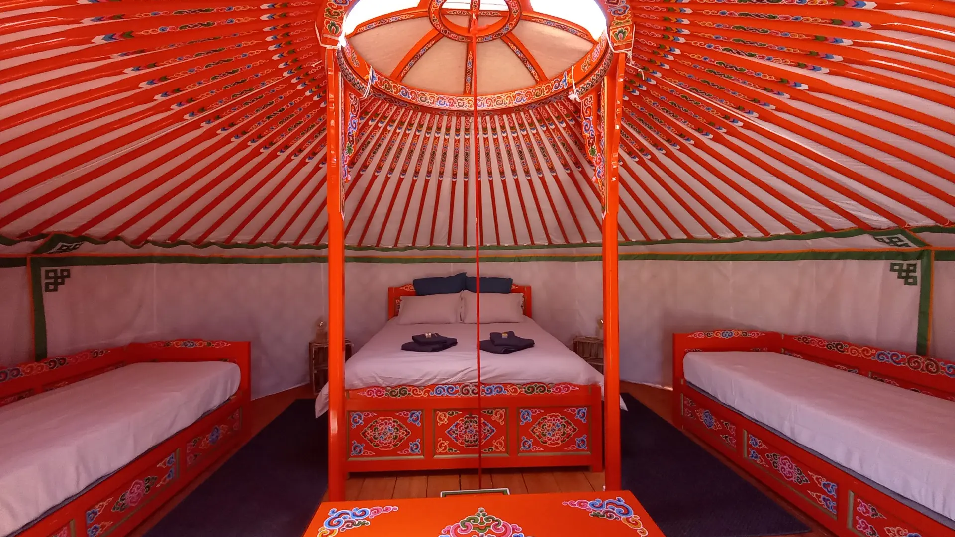 Nos yourtes mongoles font 27m2. Elles sont chacune équipée d'un lit en 160x200 et de 2 lits en 80x200. Elles sont chauffées pour vous accueillir en toutes saisons. Les yourtes, meublées avec du mobilier mongol, offrent un espace chaleureux et cocooning . Chaque yourte dispose de toilettes sèches à proximité et d'une salle d'eau privative dans le bâtiment annexe à environ 40m.