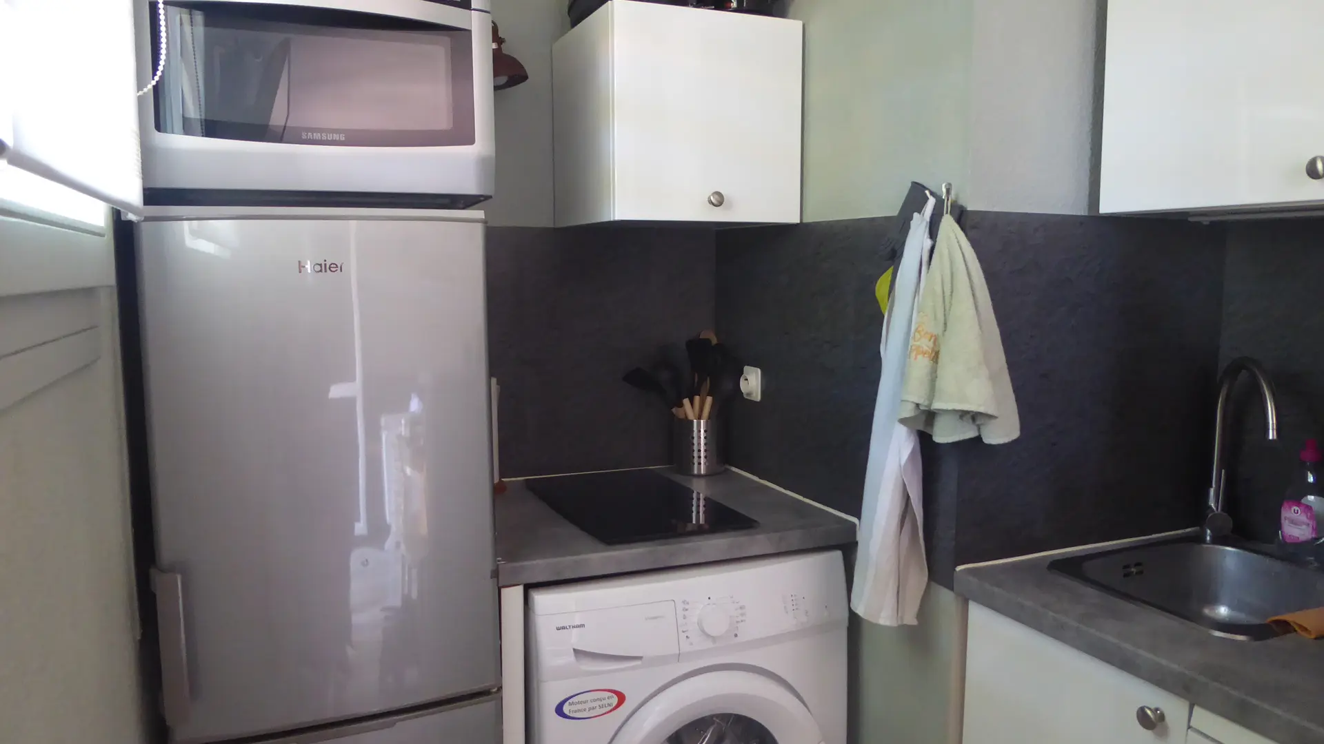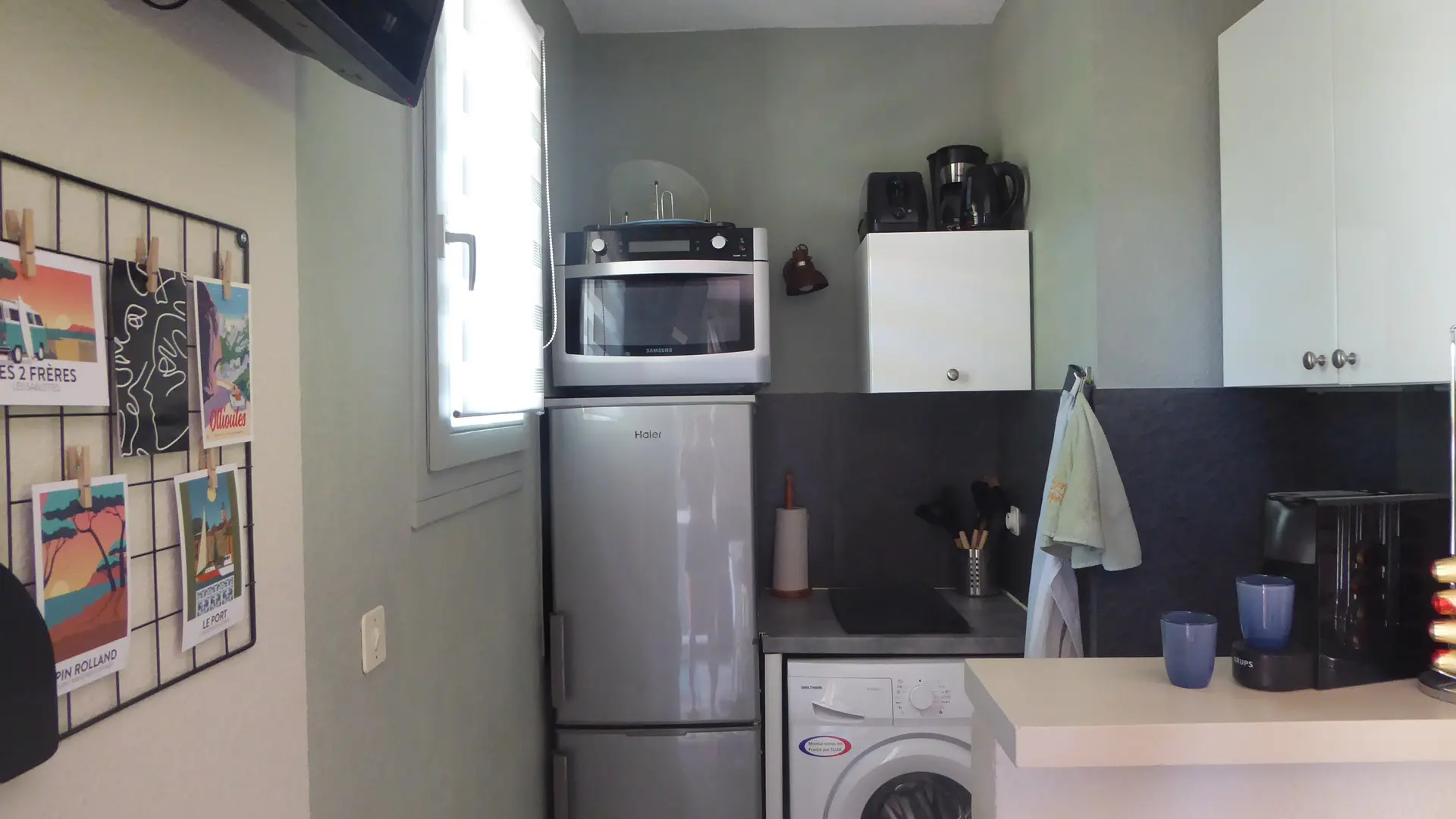 Un coin cuisine équipé, avec frigo/congélateur, plaque à induction (2 foyers), combi micro-ondes/four chaleur tournante, cafetière à filtre et Nespresso, lave-linge et lave-vaisselle, bouilloire, grille pain, couverts et vaisselle.