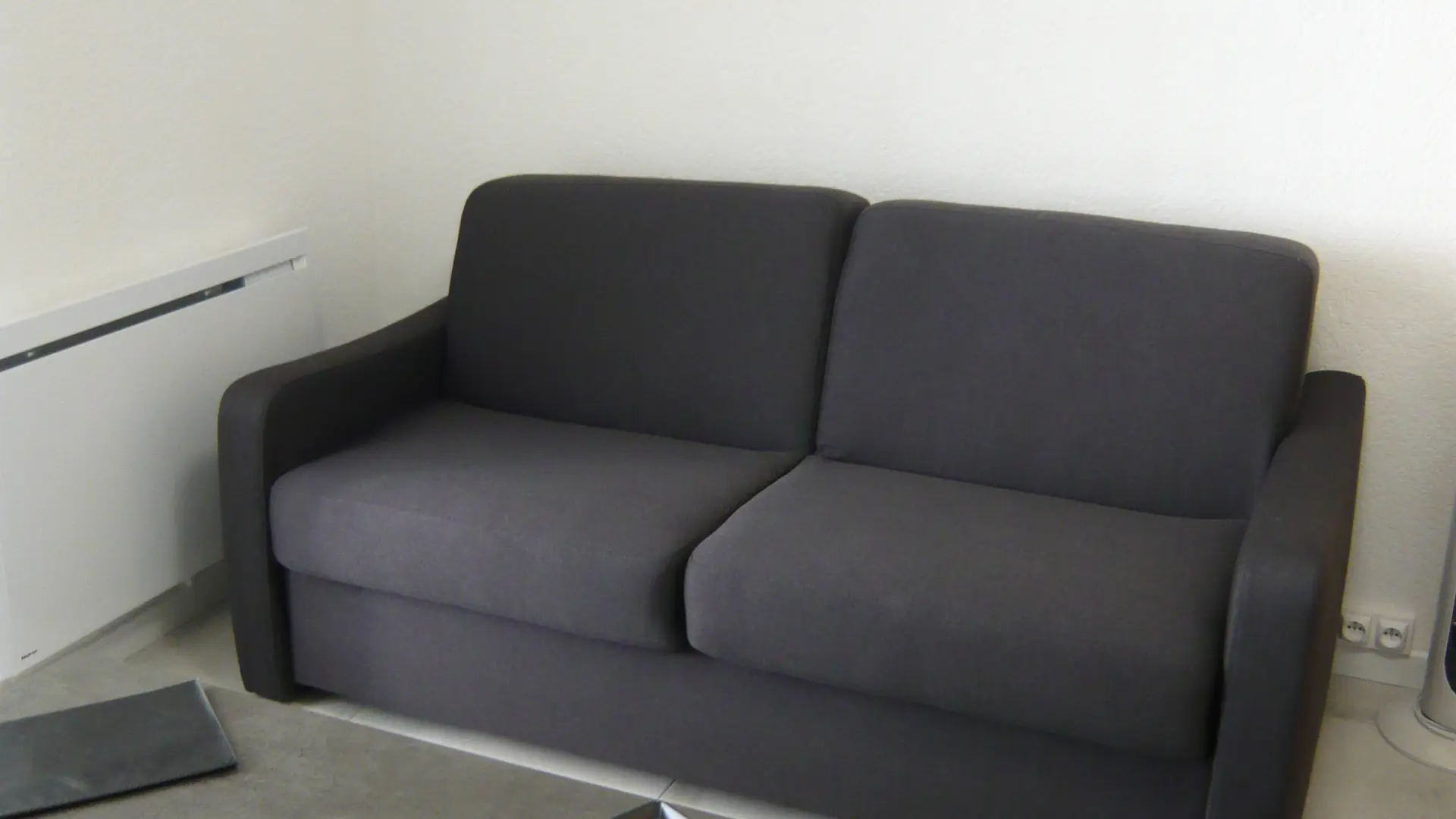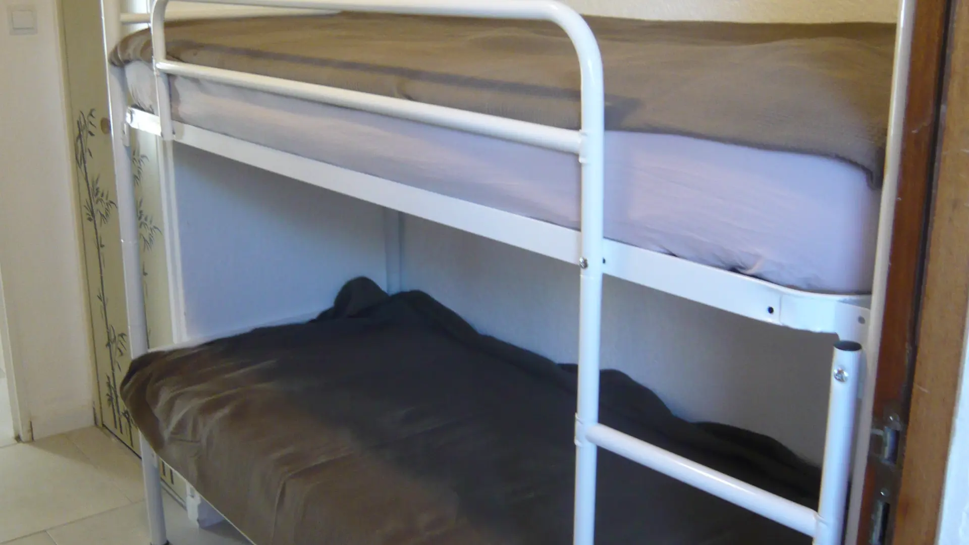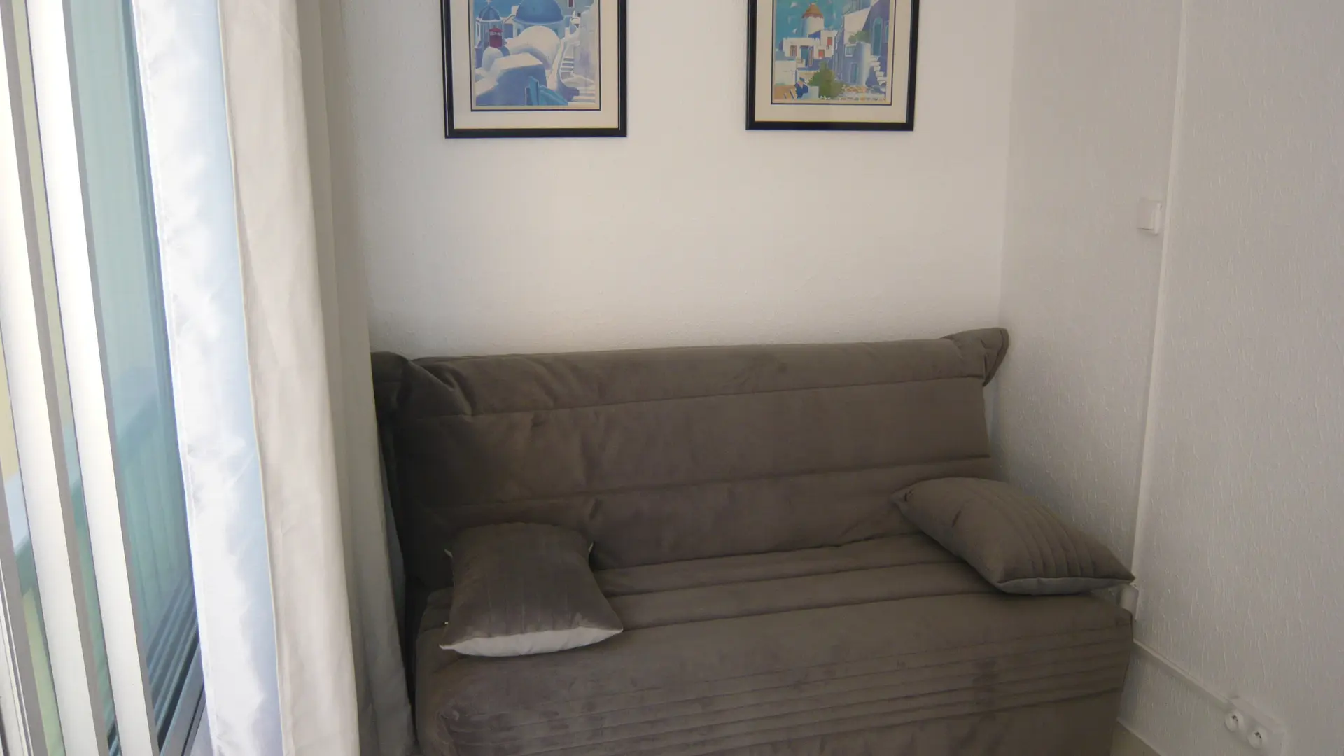 Entrée avec 2 lits superposés de 1 personne, salon avec canapé Rapido convertible de 140 (2 personnes) et loggia fermée équipée d’une banquette BZ de 140.