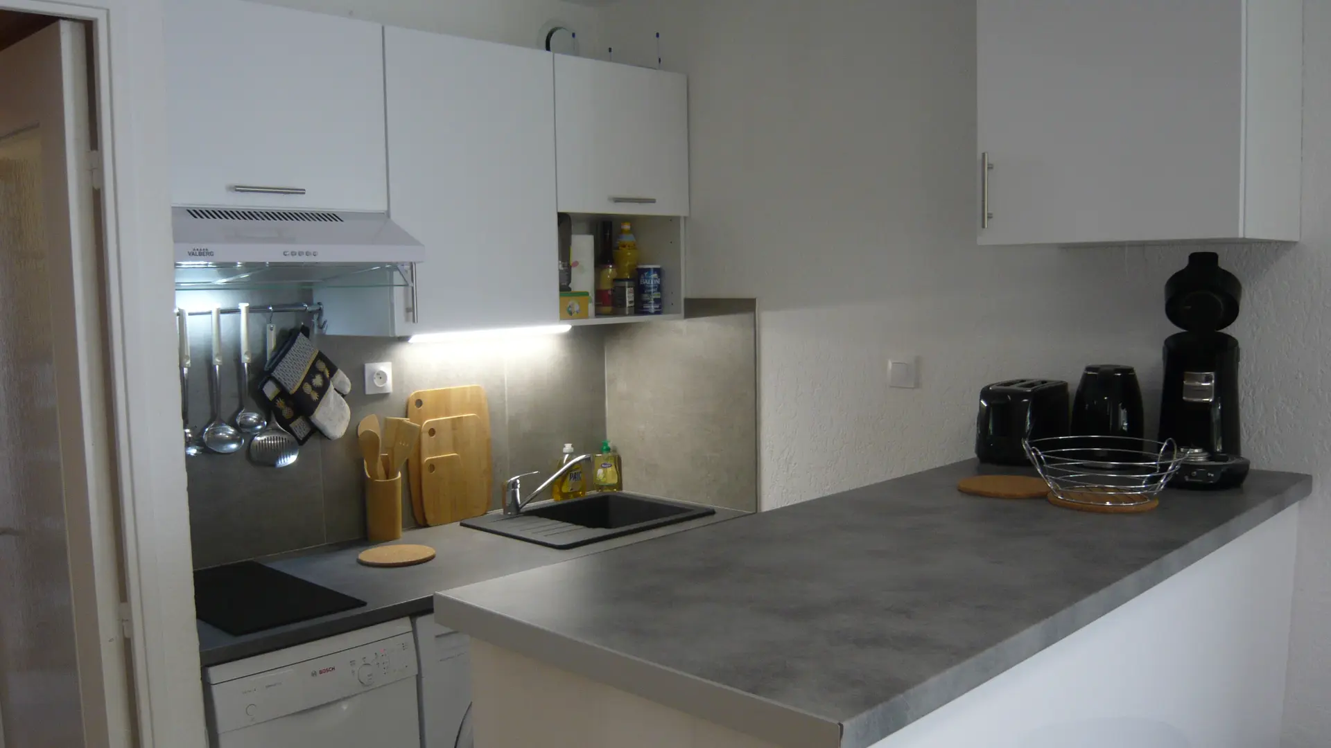 Kitchenette équipée de lave-linge, lave-vaisselle, four micro-ondes multifonctions, réfrigérateur / congélateur, plaque de cuisson, machine à café Senseo, grille-pain, bouilloire, vaisselle et ustensiles de cuisine.
