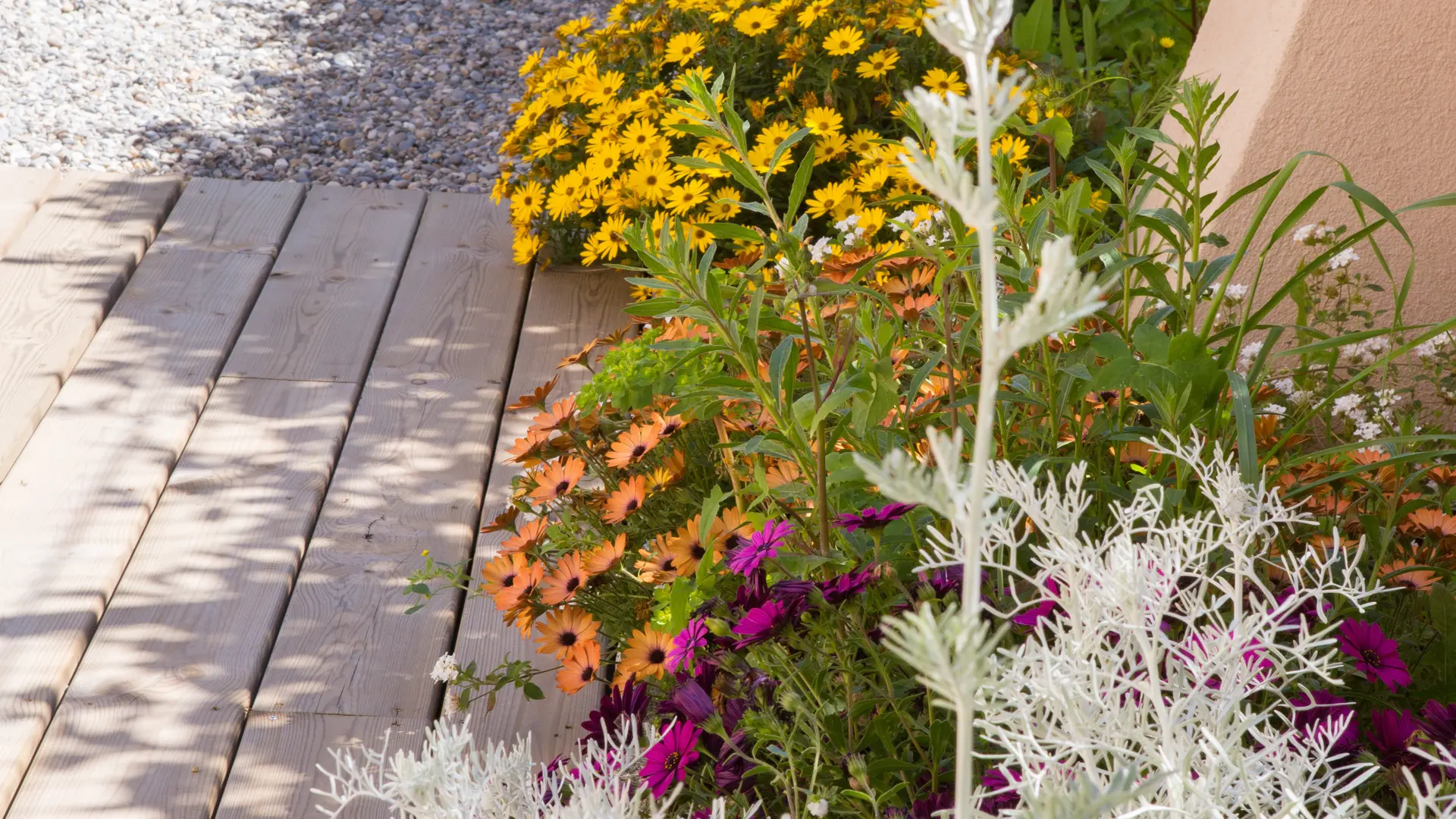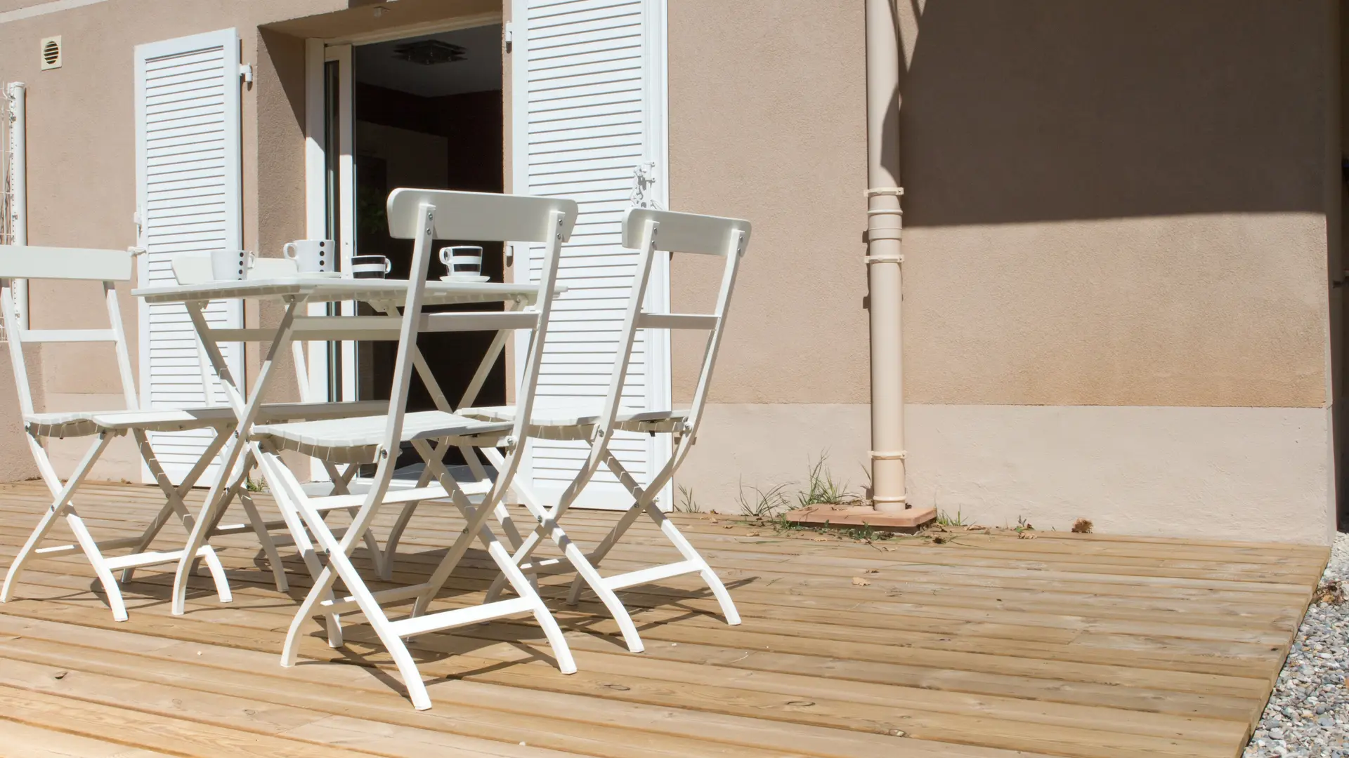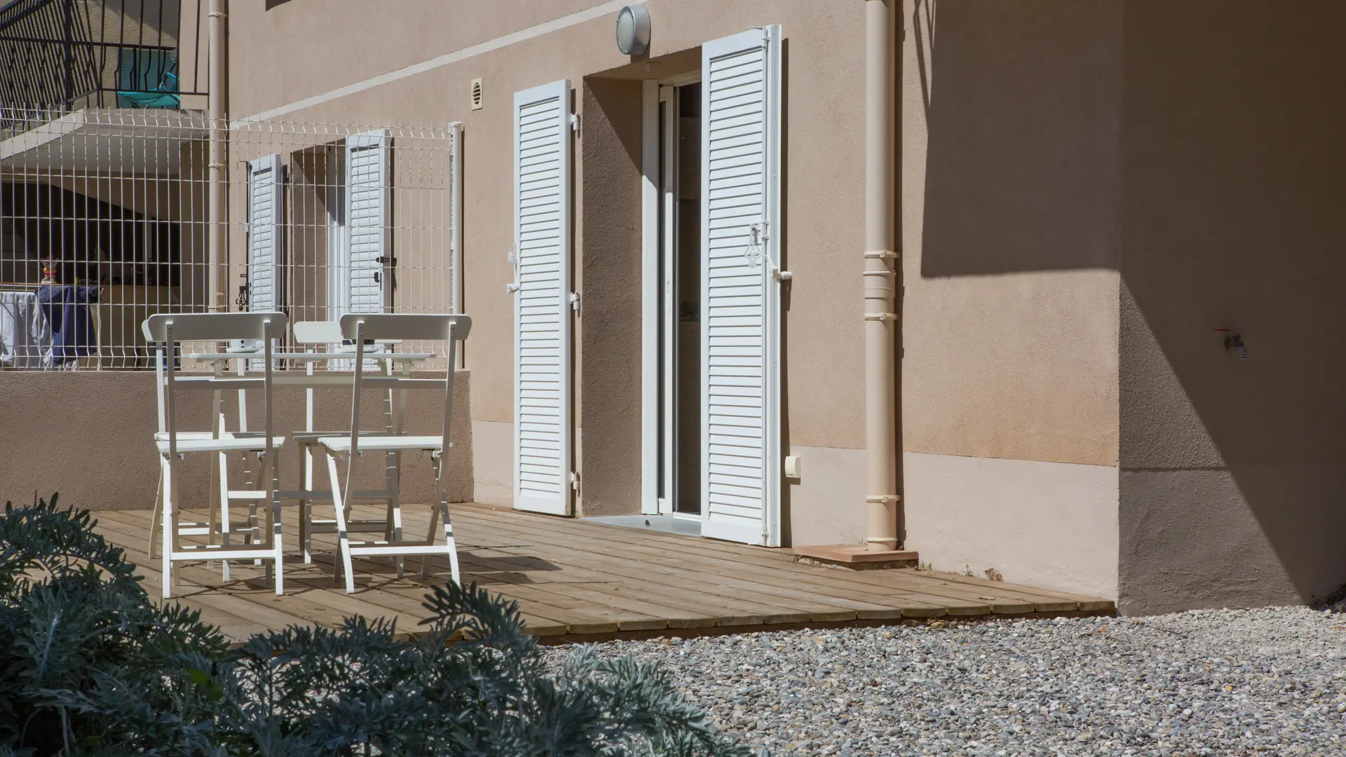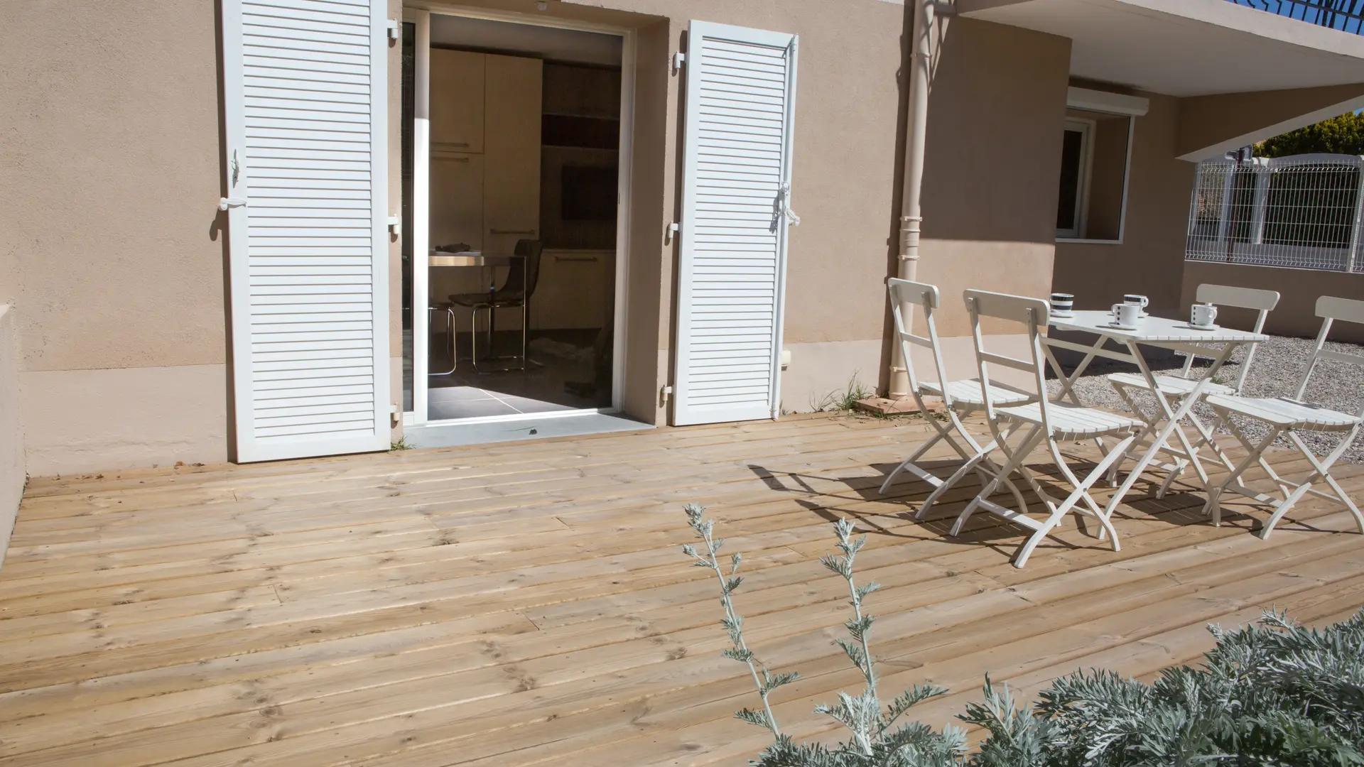 Jardin paysagé avec terrasse en bois et parking fermé 102 m2 le tout.