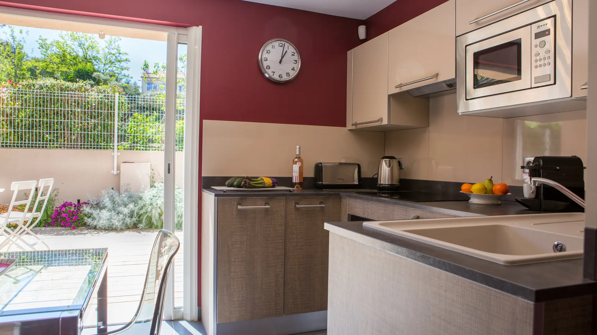 Cuisine tout équipée avec four, four micro ondes, plaque induction, lave vaisselle, frigo congélateur.