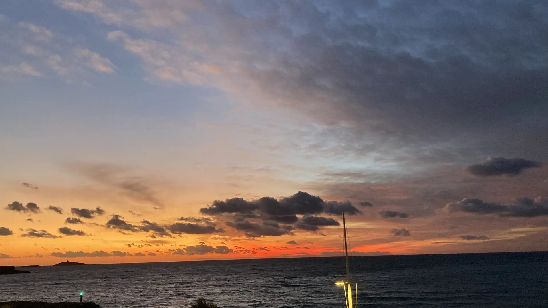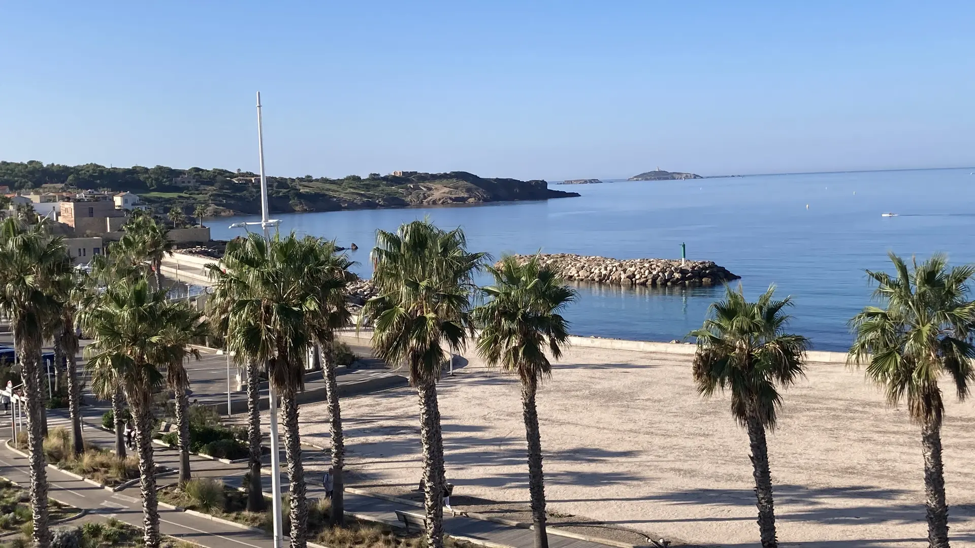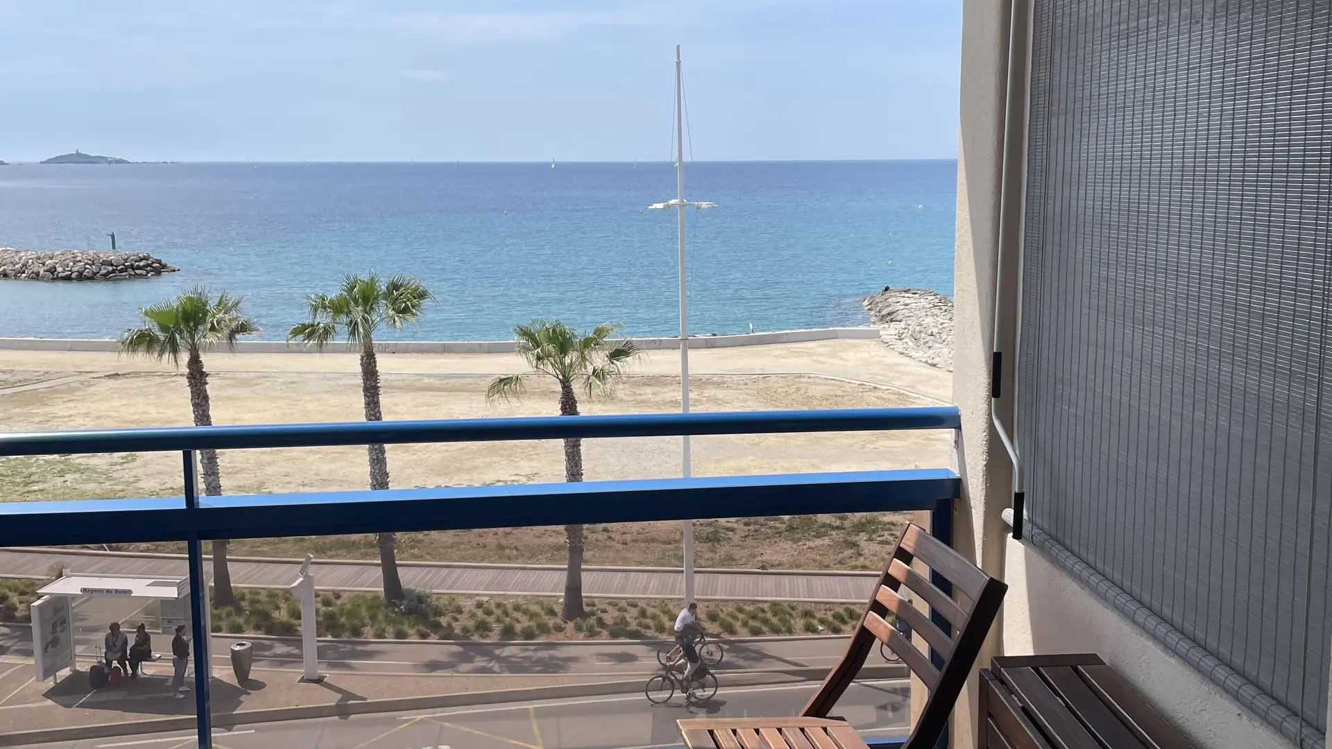 Balcon ensoleillé avec store banne, table, transat et sa vue imprenable sur la baie de Sanary et le cap Négre.