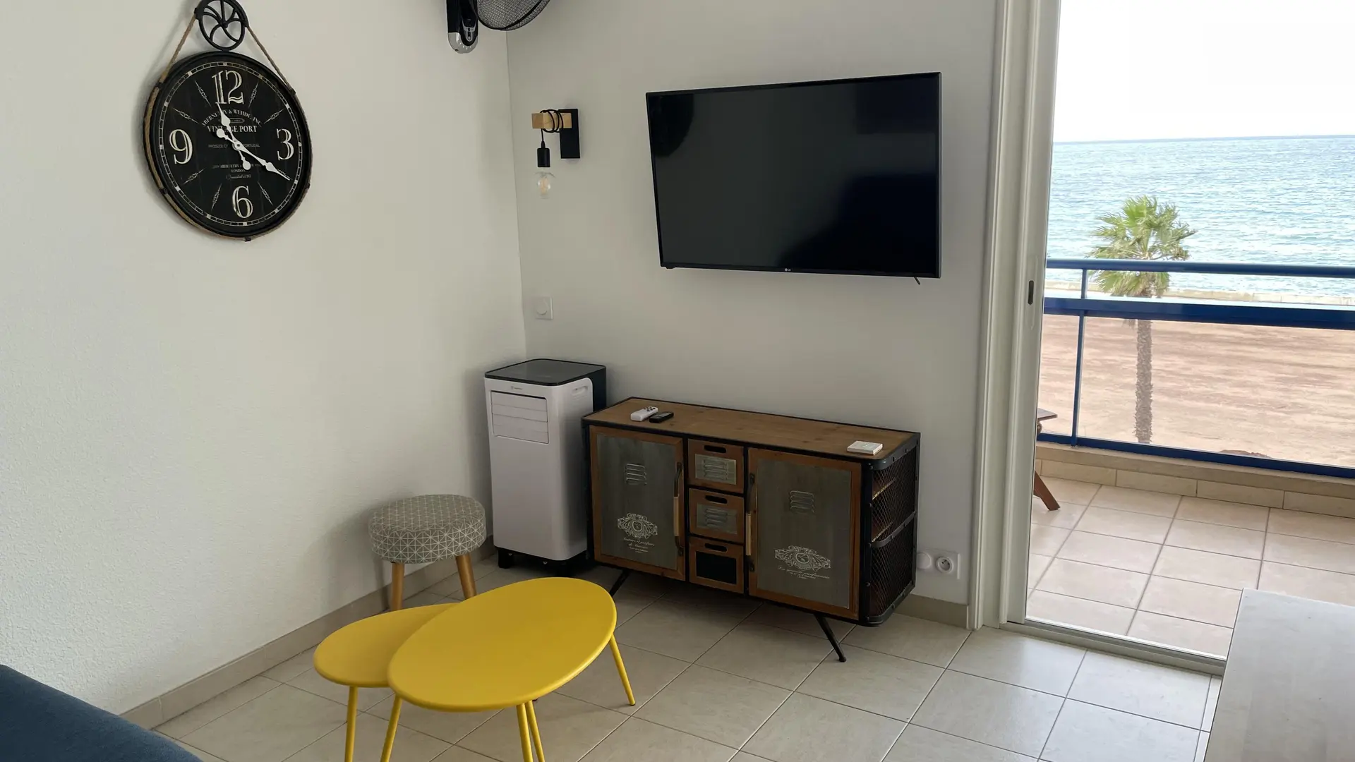 1 salon comprenant tv écran plat, 1 canapé convertible ouverture rapide.