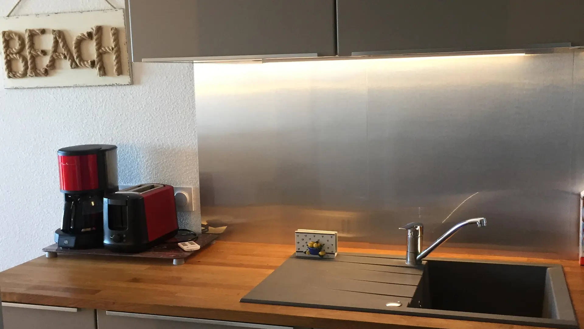 Comprenant : cuisine équipée avec plaques de cuisson, réfrigérateur, congélateur, lave-vaisselle, four micro-ondes / chaleur tournante / grille, cafetière électrique et dolce Gusto, grille-pain.