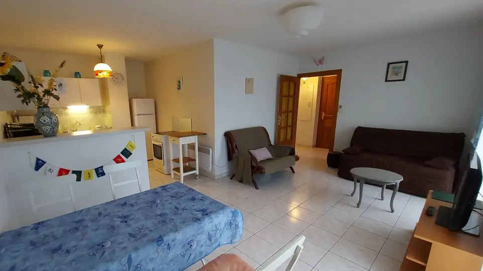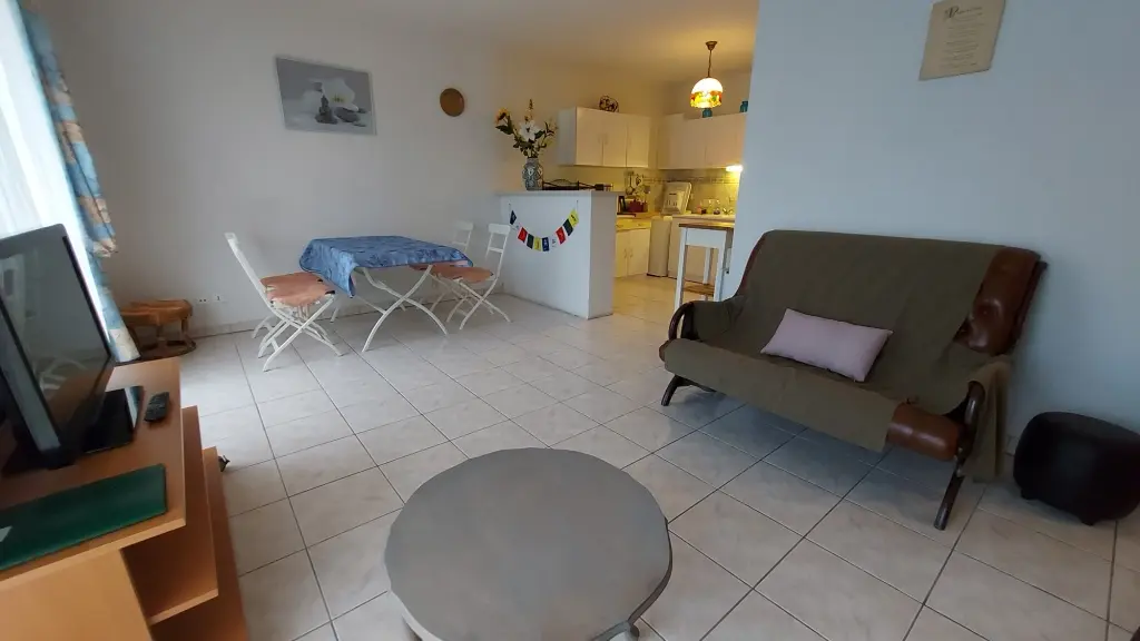 - un grand séjour (TV, canapé convertible de 140 état neuf et de qualité),