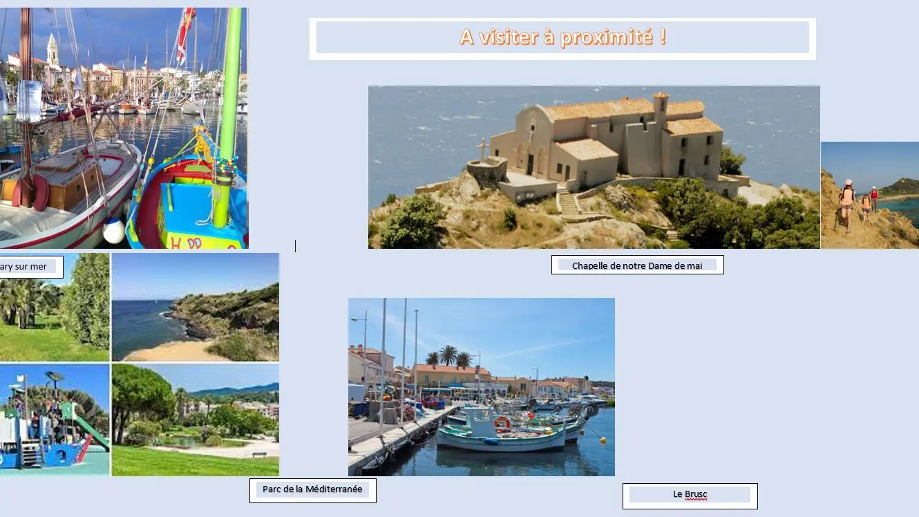 Devant la résidence, vous pourrez visiter le parc de la Méditerranée avec jeux d’enfants (manèges, trampolines, espaces verts pour pique-niquer). D'agréables pistes cyclables vous mèneront d'un côté au village pittoresque de Sanary sur Mer et son célèbre marché provençal et d'un autre jusqu'au petit village du Brusc et sa presqu'île du Gaou.