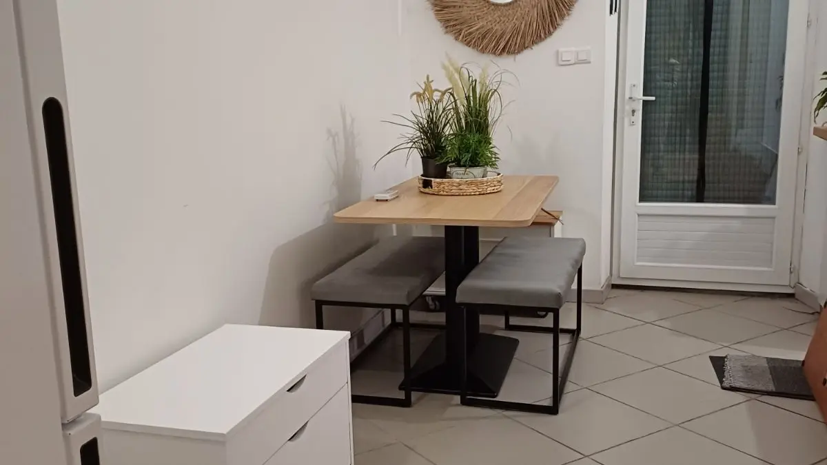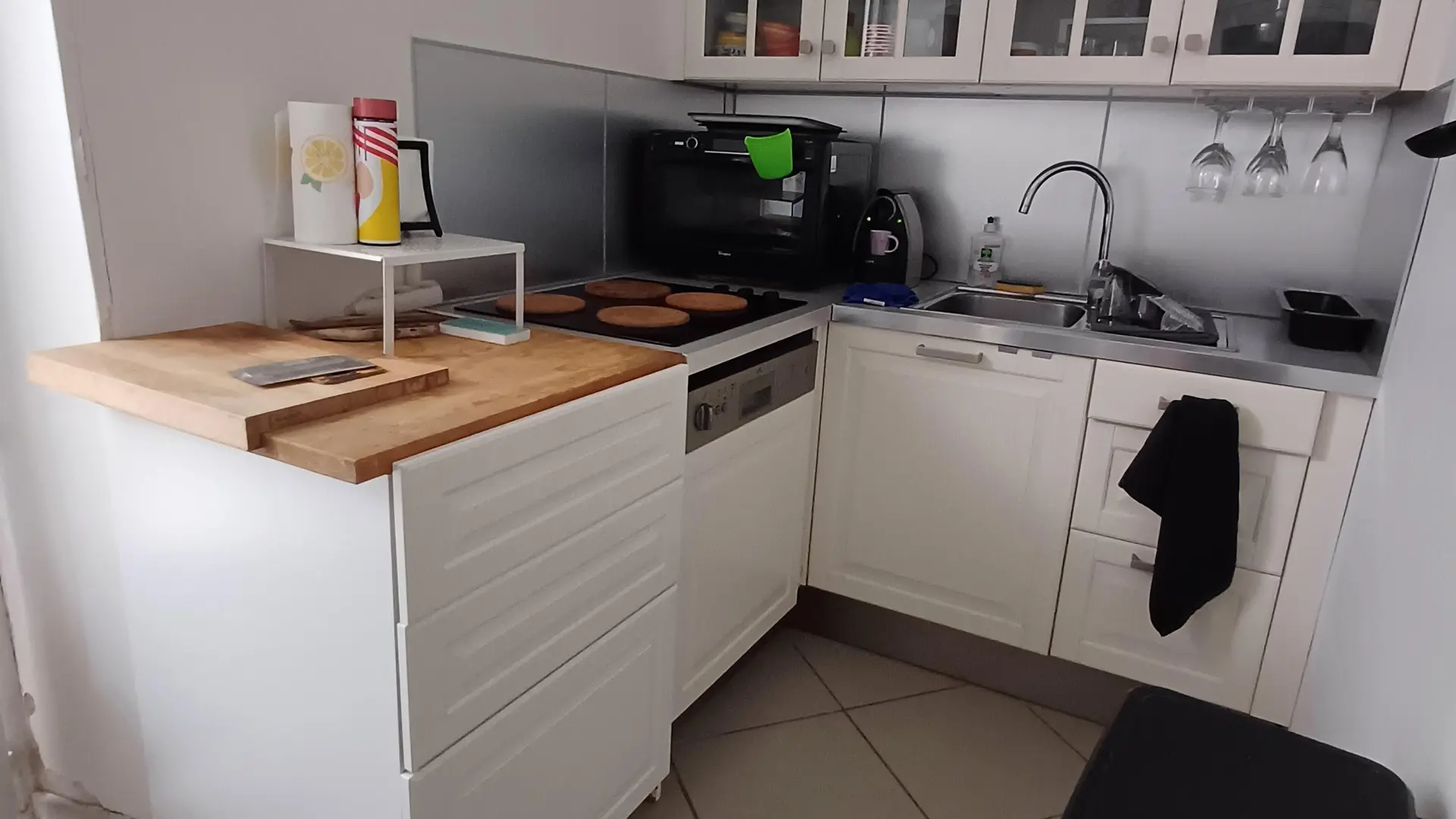 coin cuisine équipée : 2 feux induction, four posable multi-fonctions de 31 l, lave-vaisselle, bouilloire, grille-pains, cafetière à filtre et Nespresso, grand réfrigérateur-congélateur