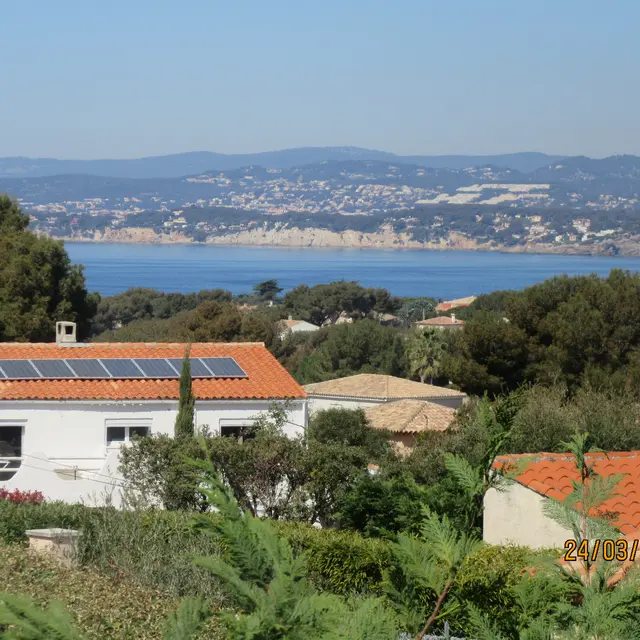 A Louer T3 50 m² au Brusc à 800m de la mer, dans un cadre verdoyant, au grand calme avec vue mer. En rez-de-chaussée d'une villa sur 1400 m² de terrain avec parc, cour, parking voiture, garage vélo. Commerces à 1200m, arrêt de bus à 300m, plage 1000m.