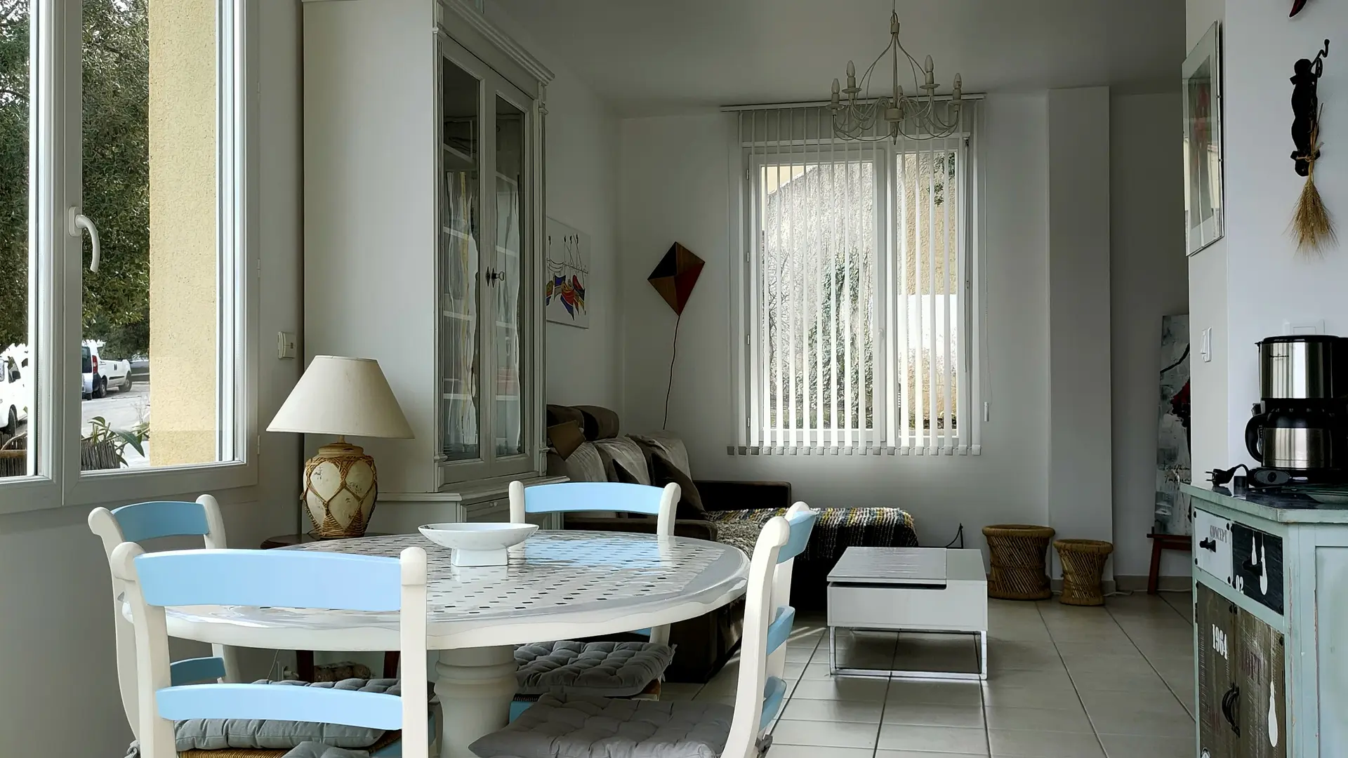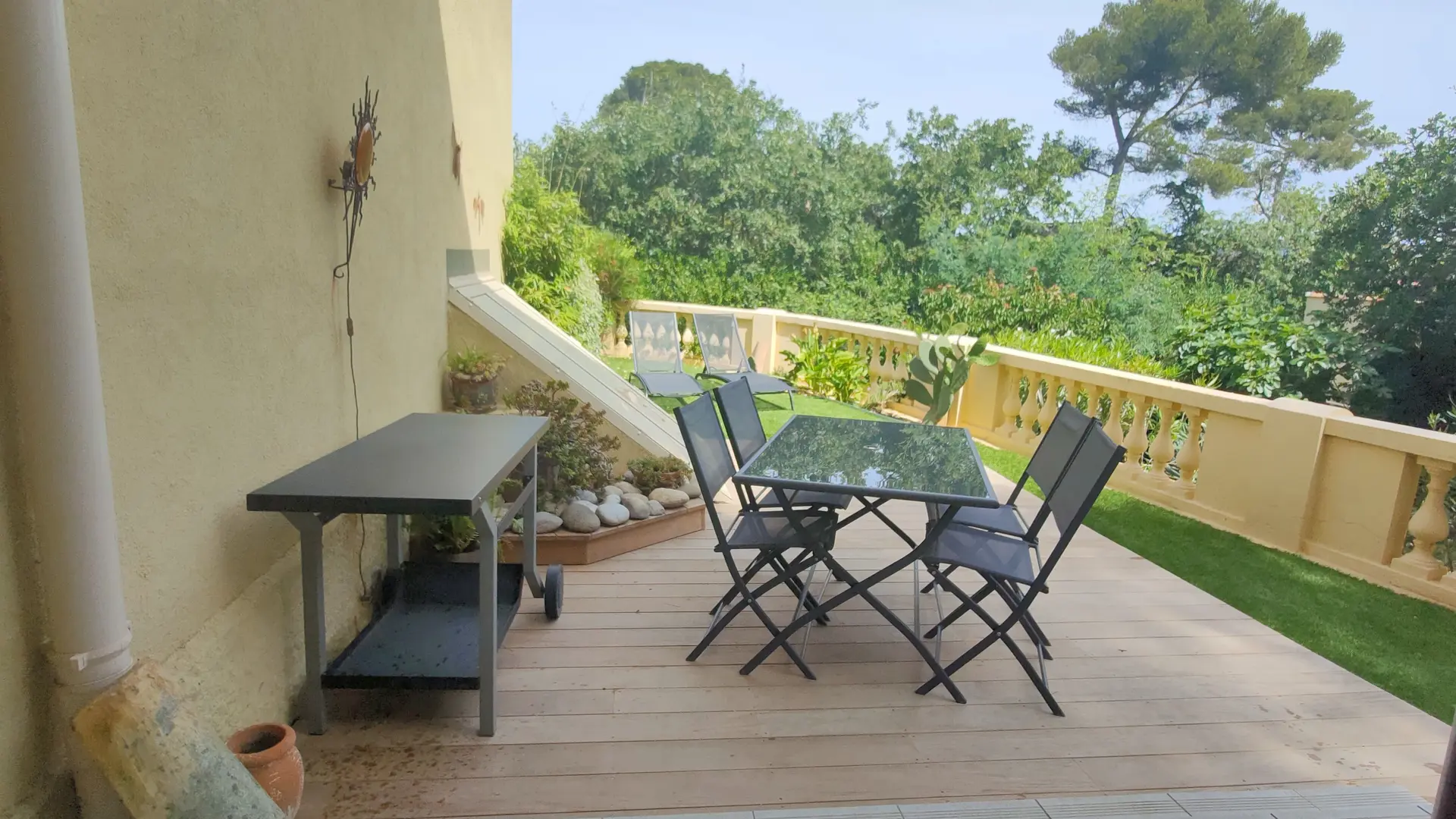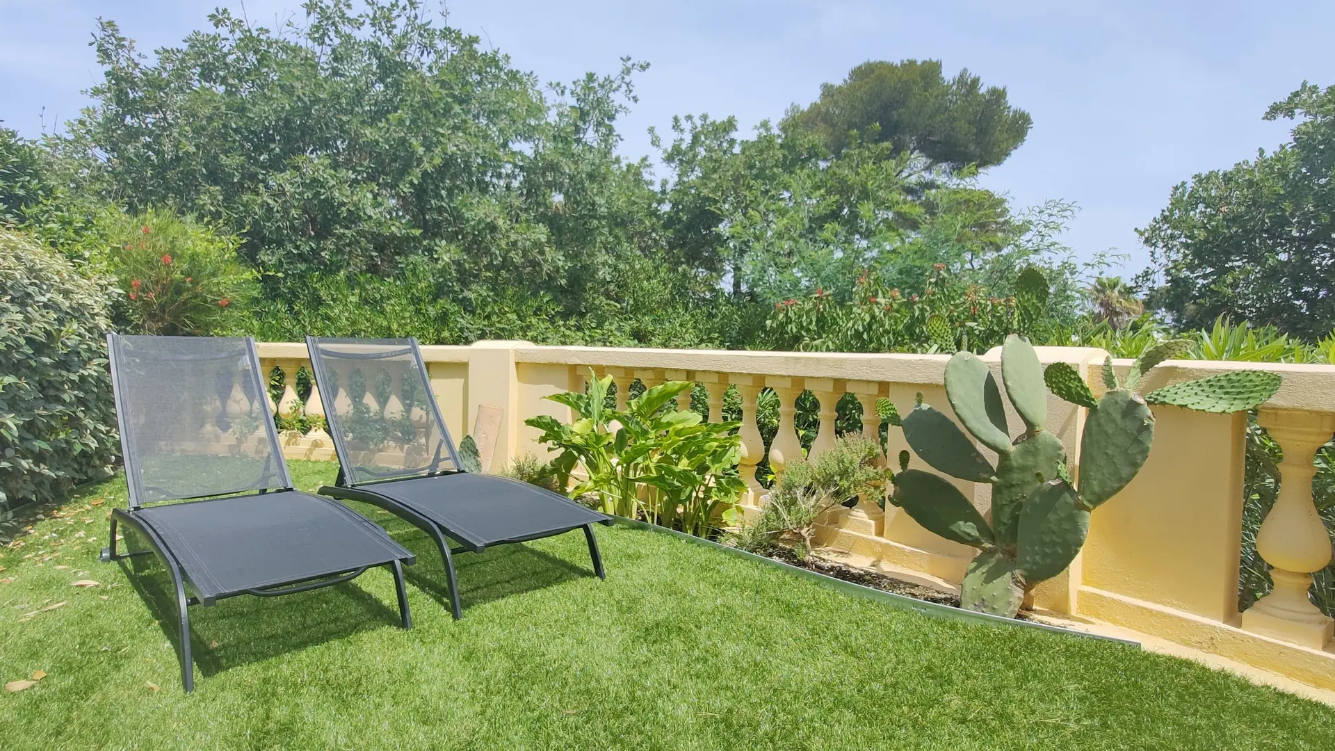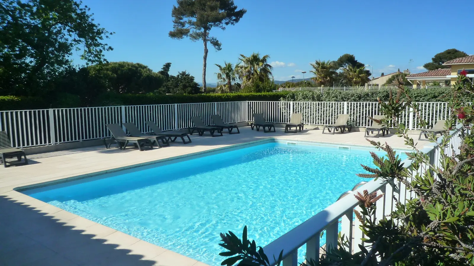 Appartement Type 2 de 58 m2, refait à neuf, dans une résidence de standing avec piscine (de mai à septembre inclus), paysagée sur 2 hectares et sécurisée, idéalement située, pouvant accueillir 4 personnes, très clair avec grandes fenêtres et porte fenêtre, très spacieux tout équipé, climatisé, Wifi, tout confort, calme, en rez de jardin d'un petit immeuble d'un étage, sans vis-à-vis avec une grande et jolie terrasse en bois exotique et petit jardin avec équipement jardin (table avec parasol, quatre chaises et deux transats).