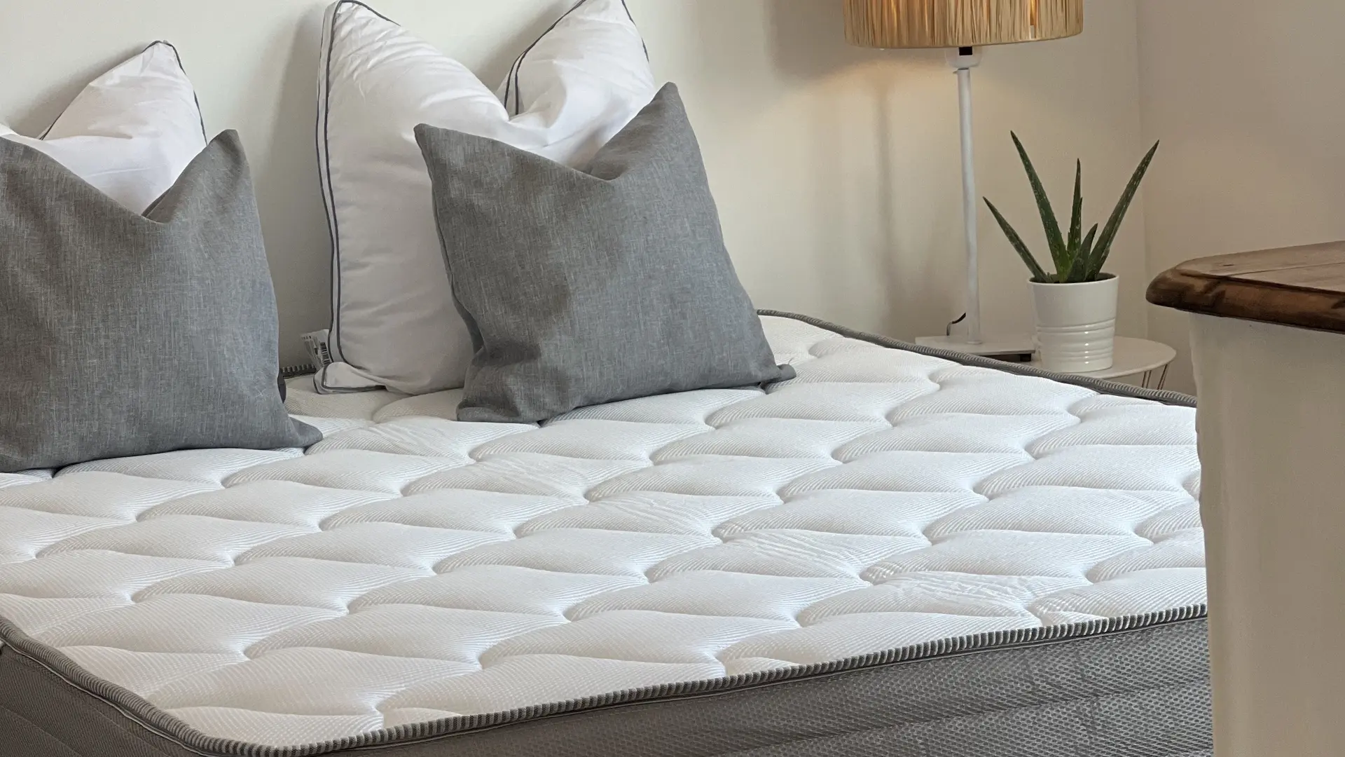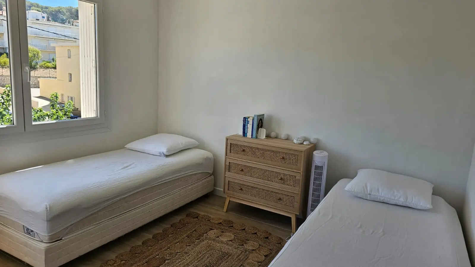 - d’une seconde chambre avec lits jumeaux (80 cm) pouvant être configurés en un lit de 160cm. Cette chambre dispose d’un grand balcon avec bain de soleil.