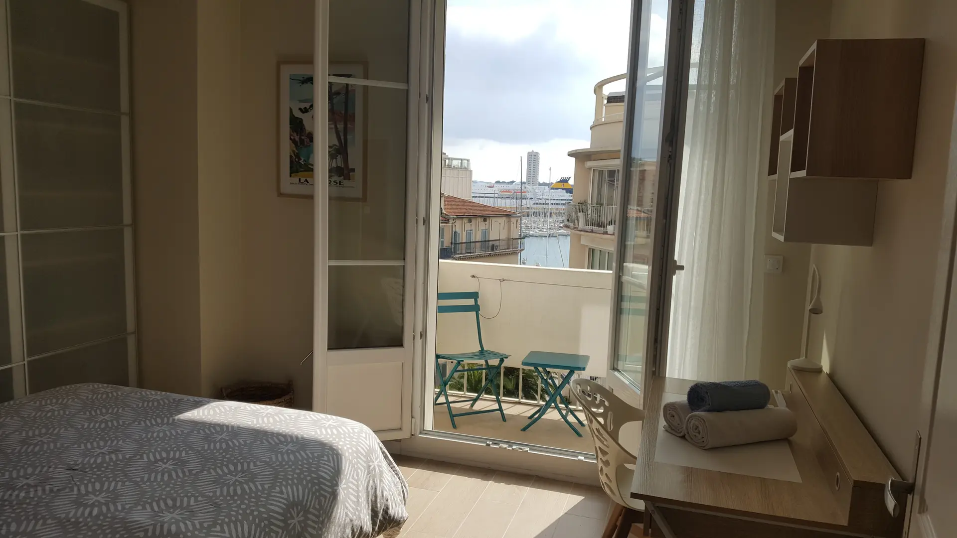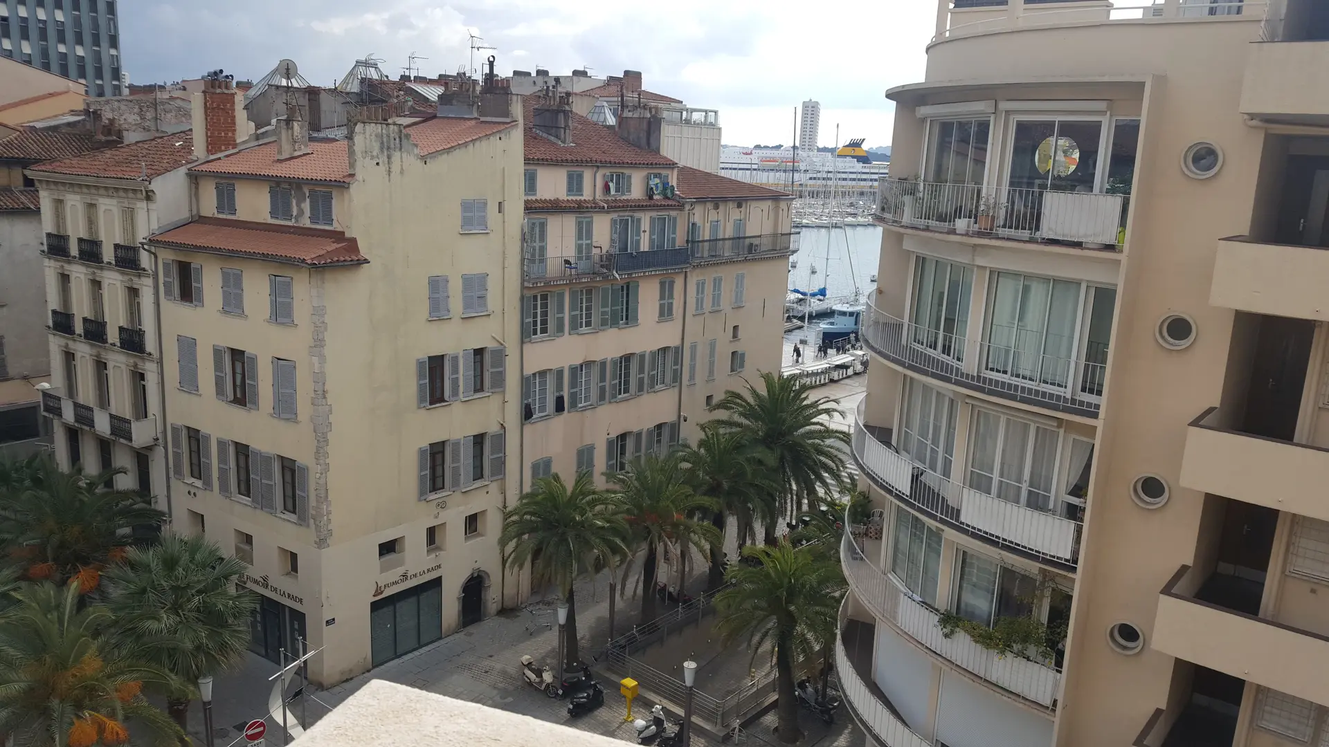 Les deux chambres ont vue sur le port de Toulon. Elles profitent d’un bacon et d’un mobilier d’extérieur.