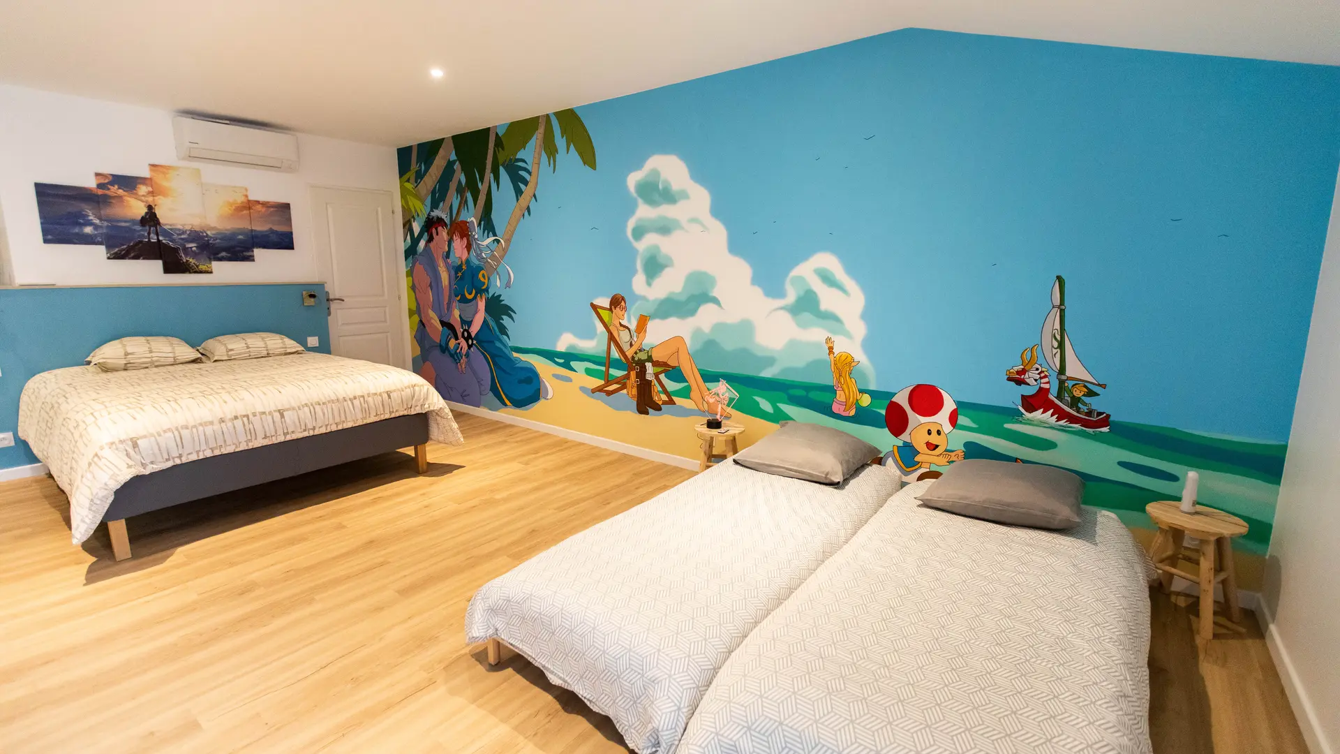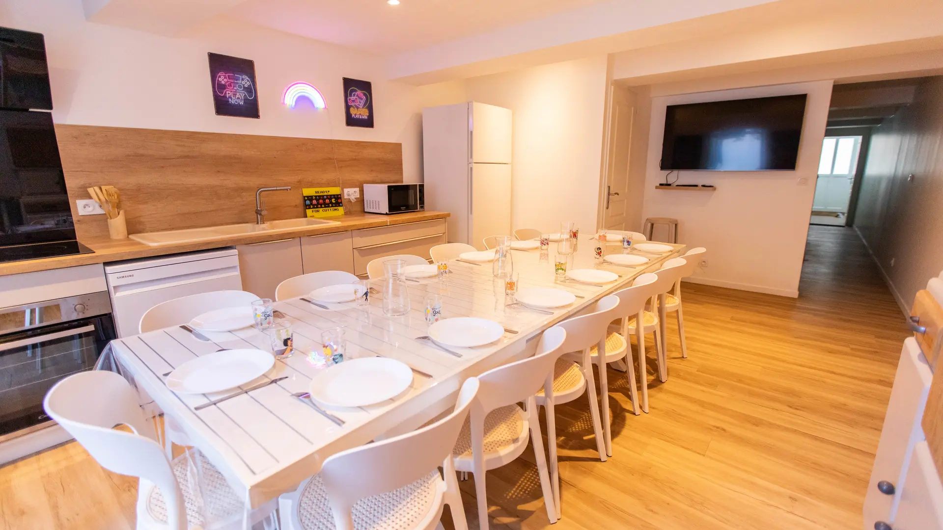 4 suites confortables, 3 salles de jeux (billard, flipper, bornes arcade, consoles, simulateur, air hockey…) et une grande cuisine conviviale pour 14 personnes.