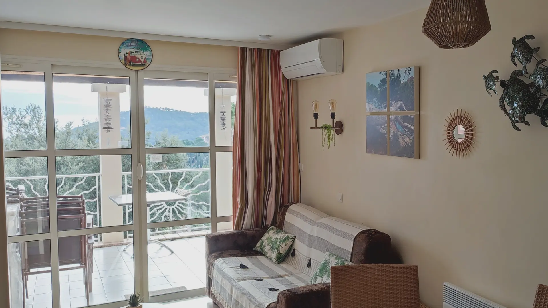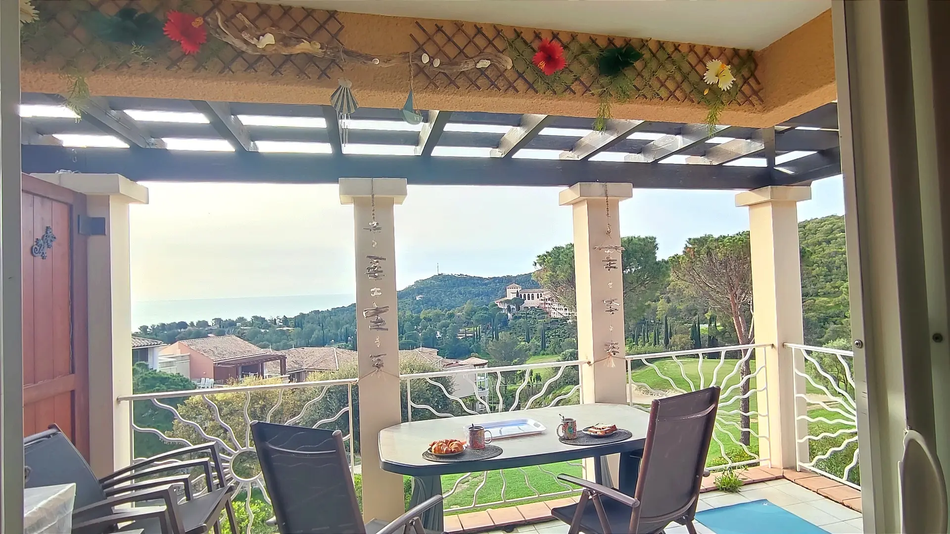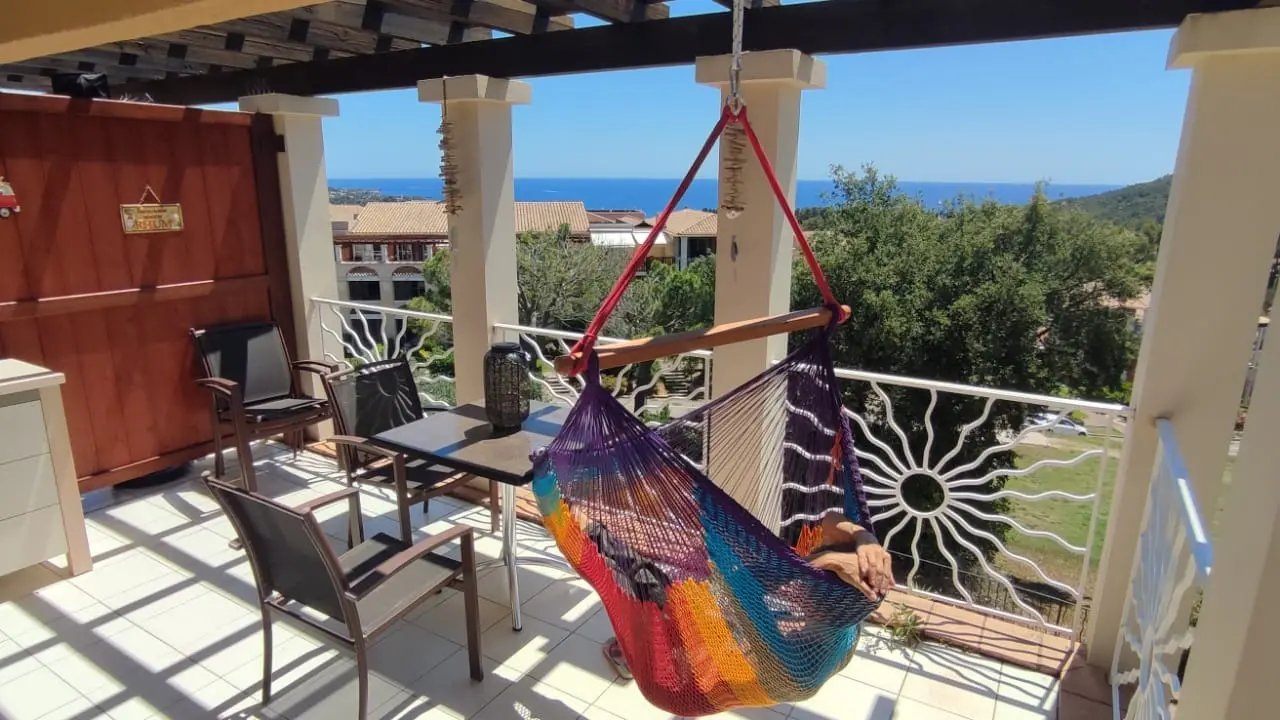 Une vue merveilleuse depuis le hamac chaise sur sa grande terrasse de 16 M2, du lever au coucher du soleil, dans un quartier du village apprécié pour son calme et son domaine arboré. Chemin de randonnée à proximité.