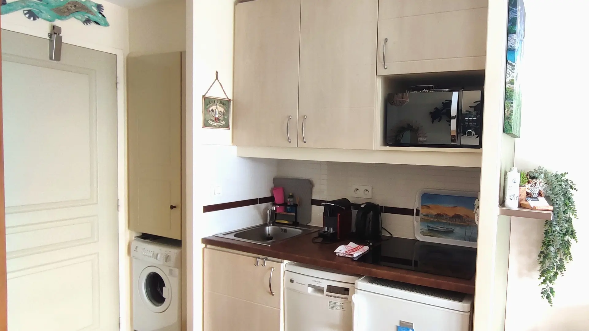 - Cuisine très bien équipée (plaque induction, lave¬vaisselle, lave-linge, frigo-congélateur -18°, four combiné grill micro-ondes, grill pain, cafetière Magimix, bouilloire, raclette crêpière grill, etc..